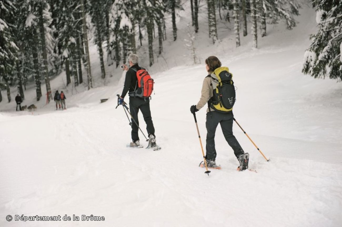 Du poteau Le Grand Echaillon (alt. 1162m), partir en empruntant la piste damée qui part à l'horizontale derrière l'auberge du Grand Echaillon. Suivre le balisage raquettes pour rejoindre un champ.