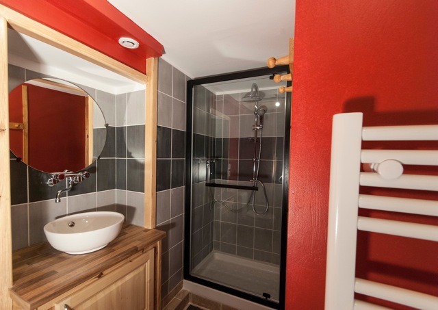 La salle de bain comprend une grande douche, un lavabo-vasque, un sèche-cheveux, un sèche-serviettes et des WC.