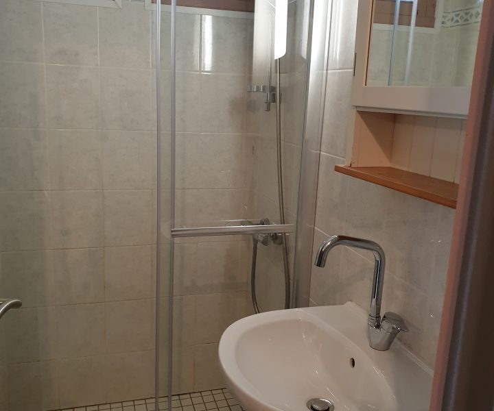 Une salle de bain avec douche et WC séparés.