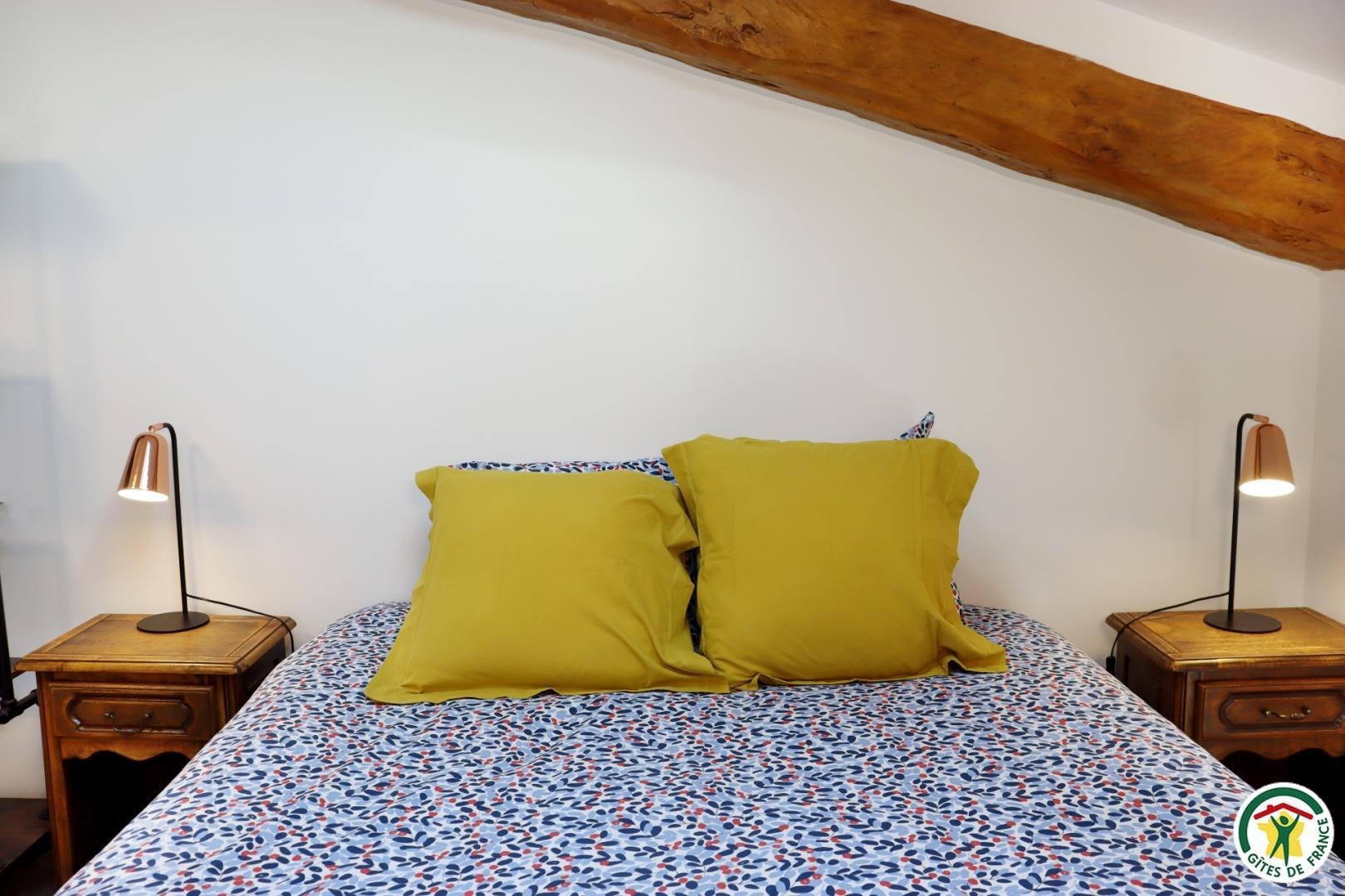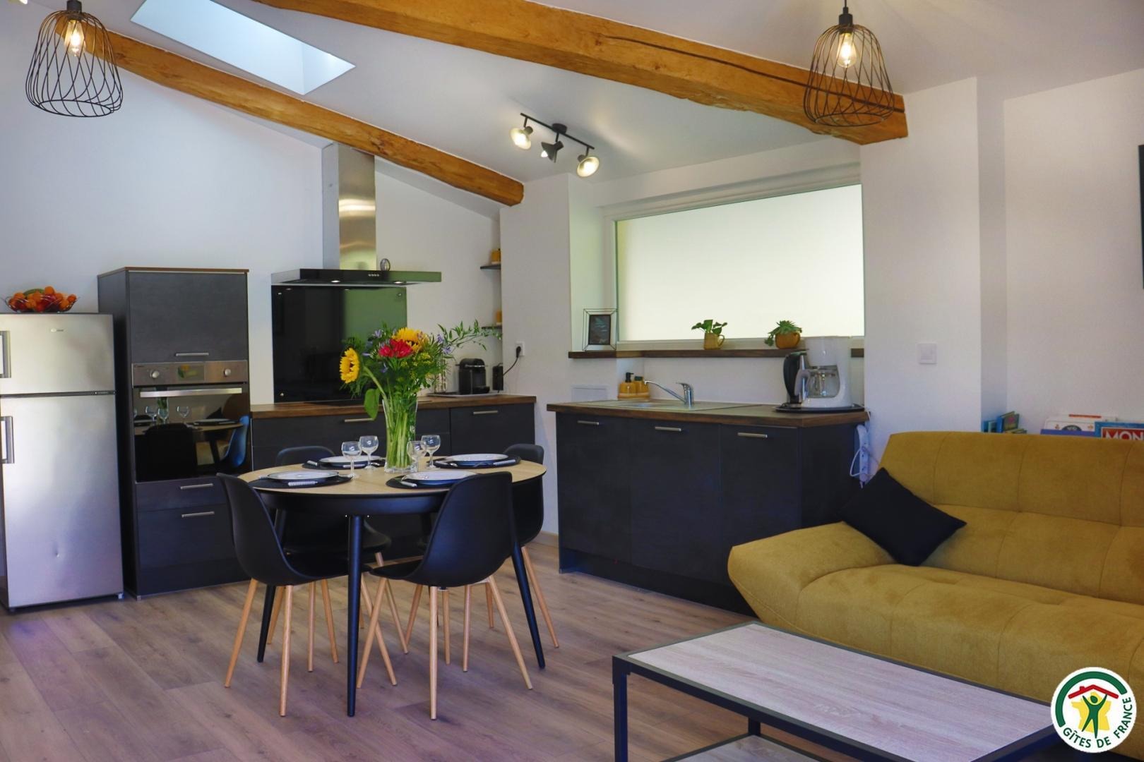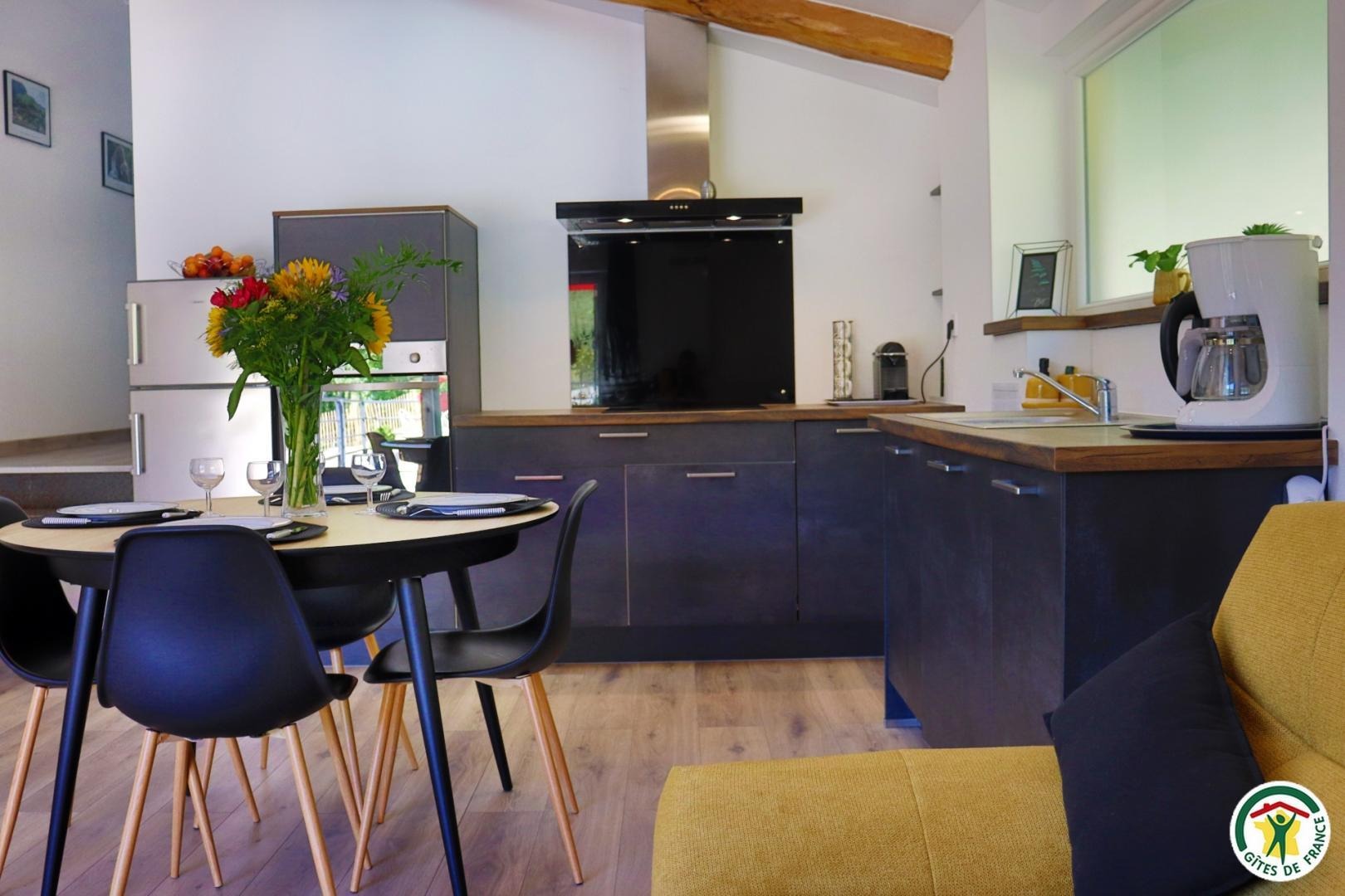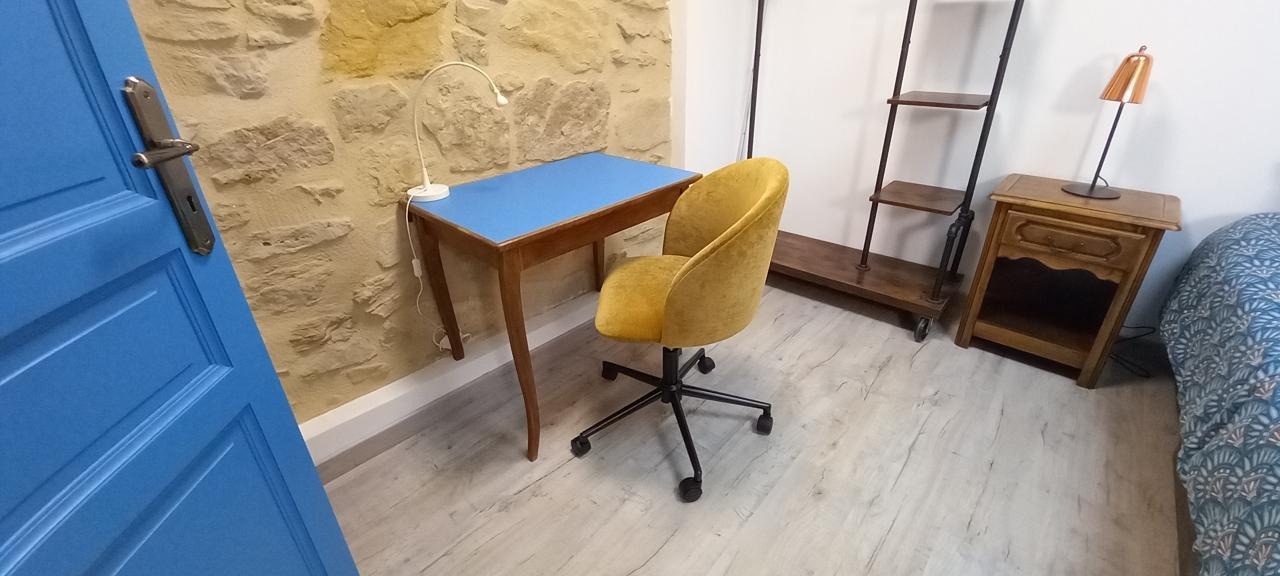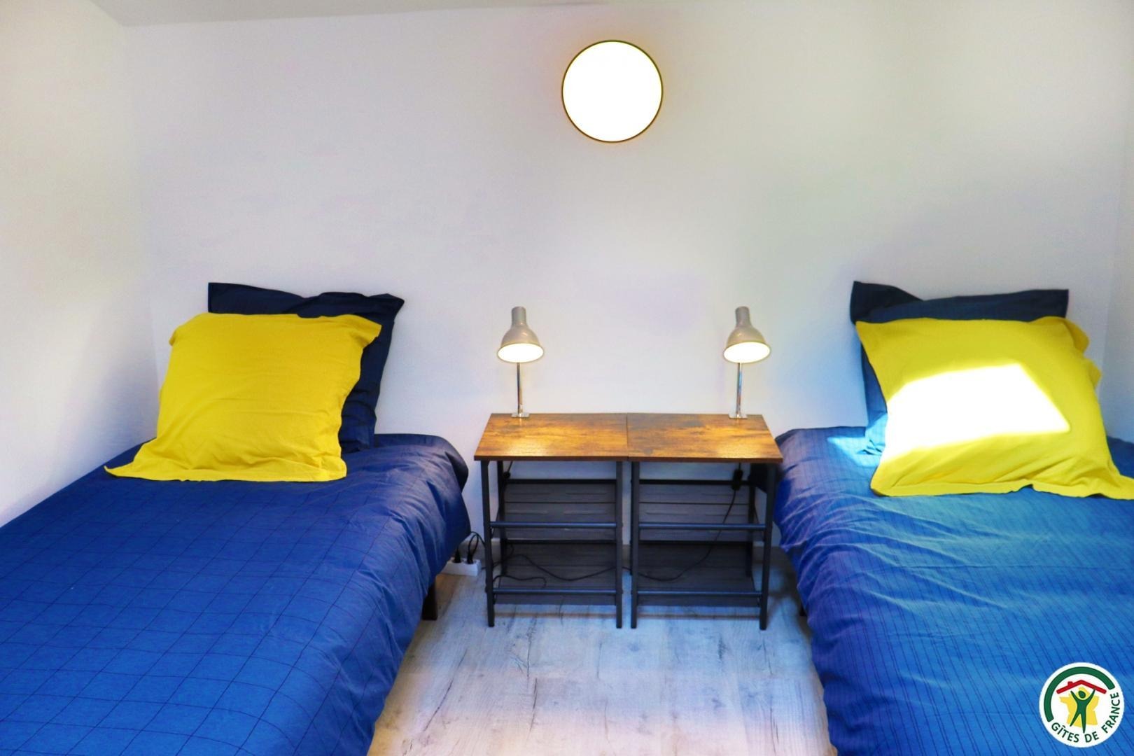 Appartement mitoyen par le côté à un futur gîte (travaux en cours), les propriétaires résident sur place. Entrée indépendante, stationnement sur place et terrain clos. Accès à l'hébergement par 3 marches et par un petit chemin jusqu'à la terrasse privative (salon de jardin, parasol, barbecue charbon). Entrée par la pièce à vivre dotée d'une cuisine équipée, d'un espace repas et d'un coin salon avec canapé, TV, poêle à bois. Une chambre avec un lit double (1x160) et une seconde chambre avec deux lits simples (2x90). Toutes deux disposent d'un velux et d'un rangement. Salle d'eau (douche italienne avec rideau, lavabo, sèche-serviette) et wc indépendant (sanibroyeur). La façade du gîte n'a pas encore été refaite, elle le sera en même temps que la façade du second gîte, en cours d'aménagement.