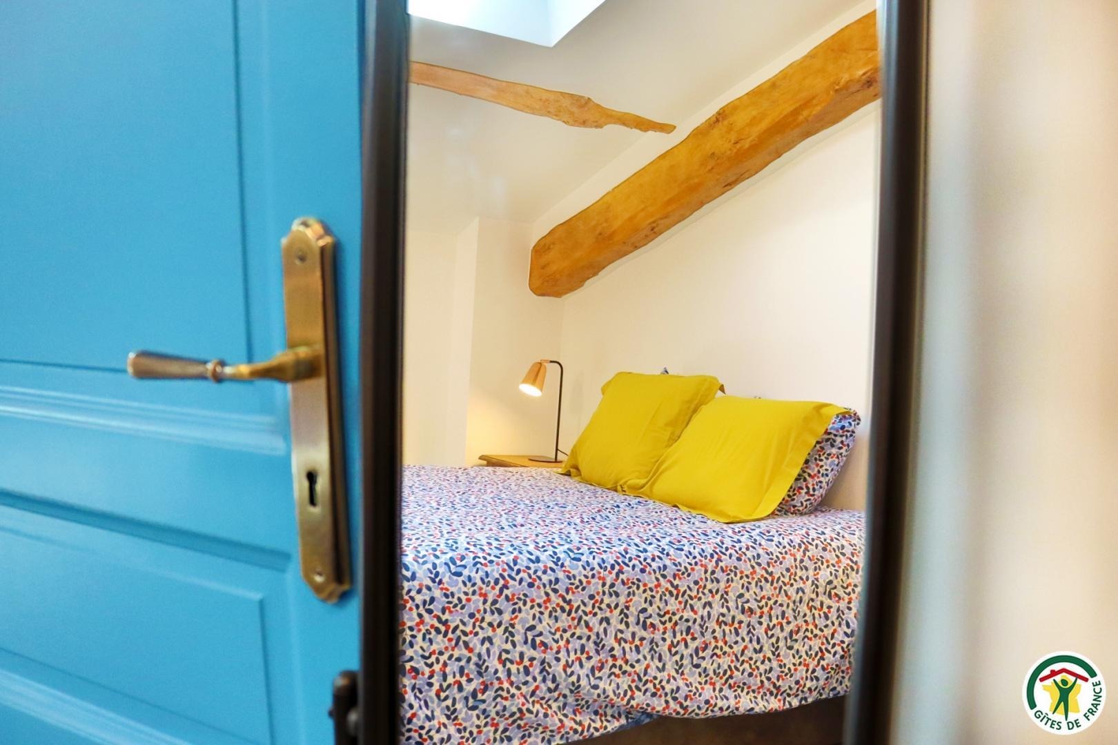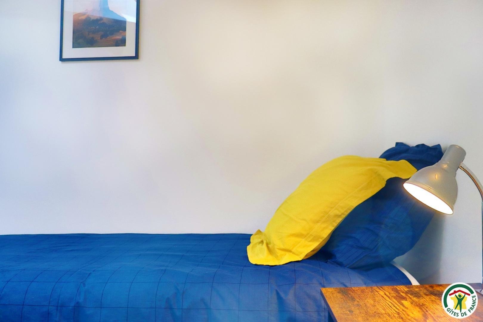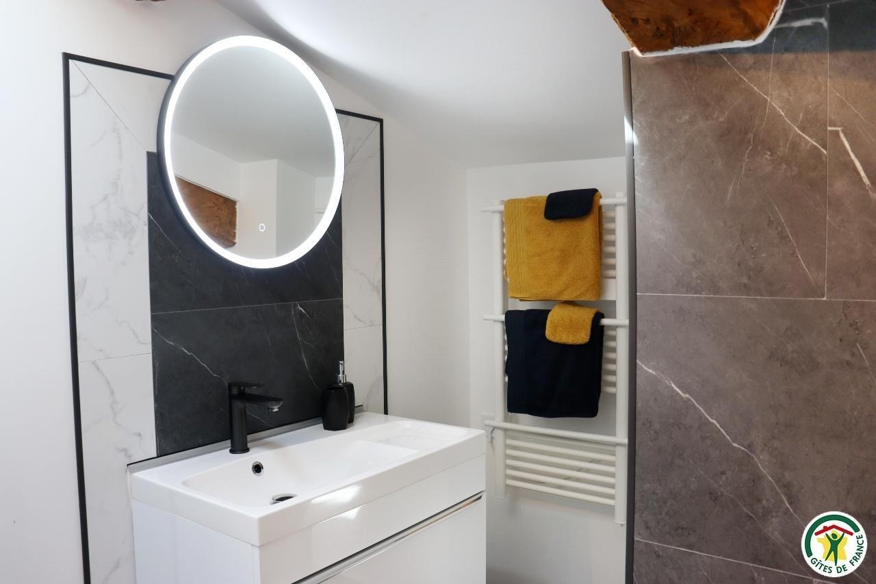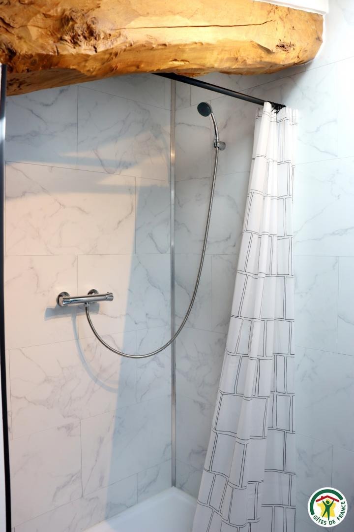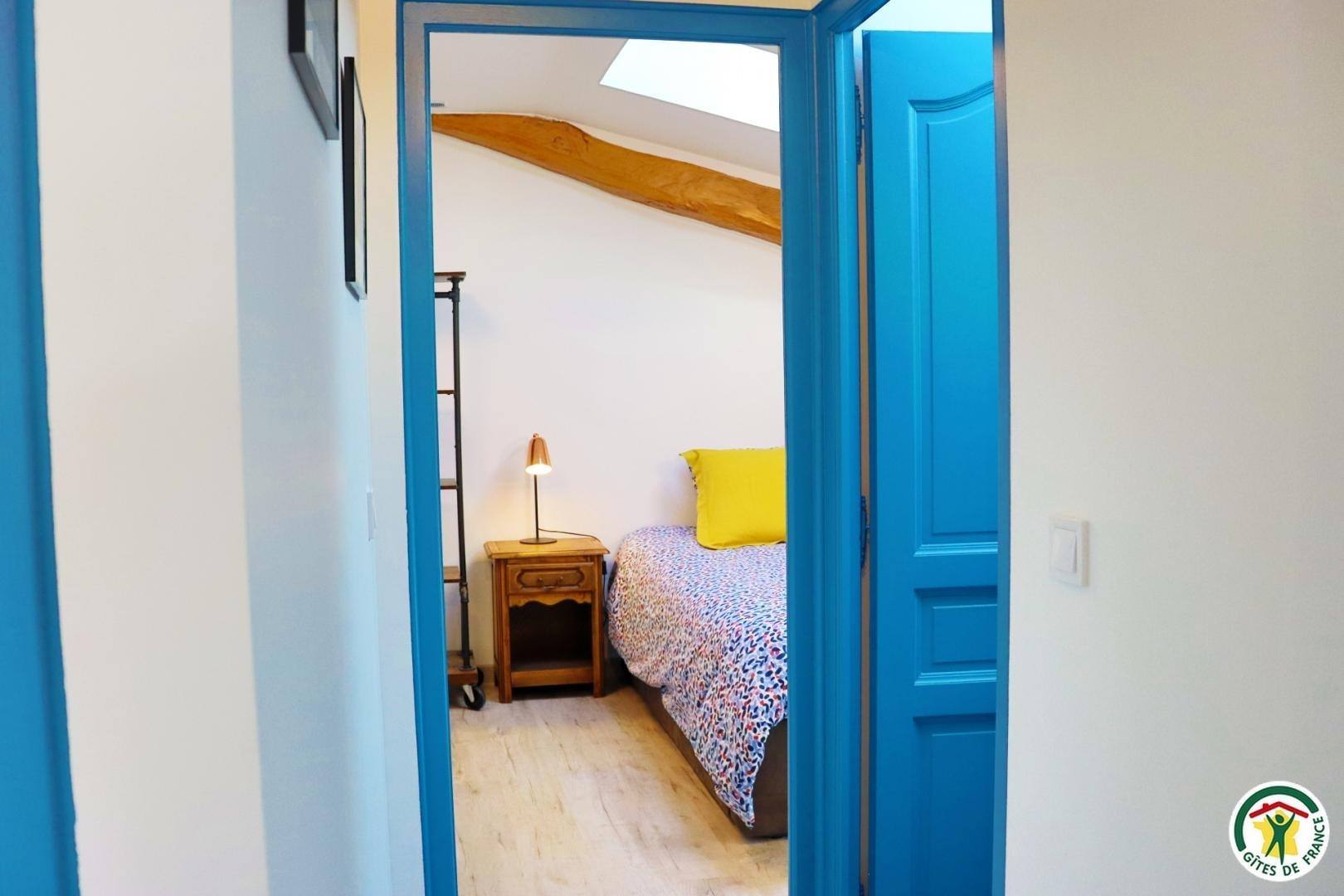 Appartement mitoyen par le côté à un futur gîte (travaux en cours), les propriétaires résident sur place. Entrée indépendante, stationnement sur place et terrain clos. Accès à l'hébergement par 3 marches et par un petit chemin jusqu'à la terrasse privative (salon de jardin, parasol, barbecue charbon). Entrée par la pièce à vivre dotée d'une cuisine équipée, d'un espace repas et d'un coin salon avec canapé, TV, poêle à bois. Une chambre avec un lit double (1x160) et une seconde chambre avec deux lits simples (2x90). Toutes deux disposent d'un velux et d'un rangement. Salle d'eau (douche italienne avec rideau, lavabo, sèche-serviette) et wc indépendant (sanibroyeur). La façade du gîte n'a pas encore été refaite, elle le sera en même temps que la façade du second gîte, en cours d'aménagement.