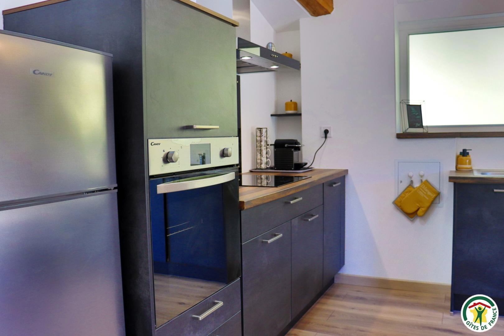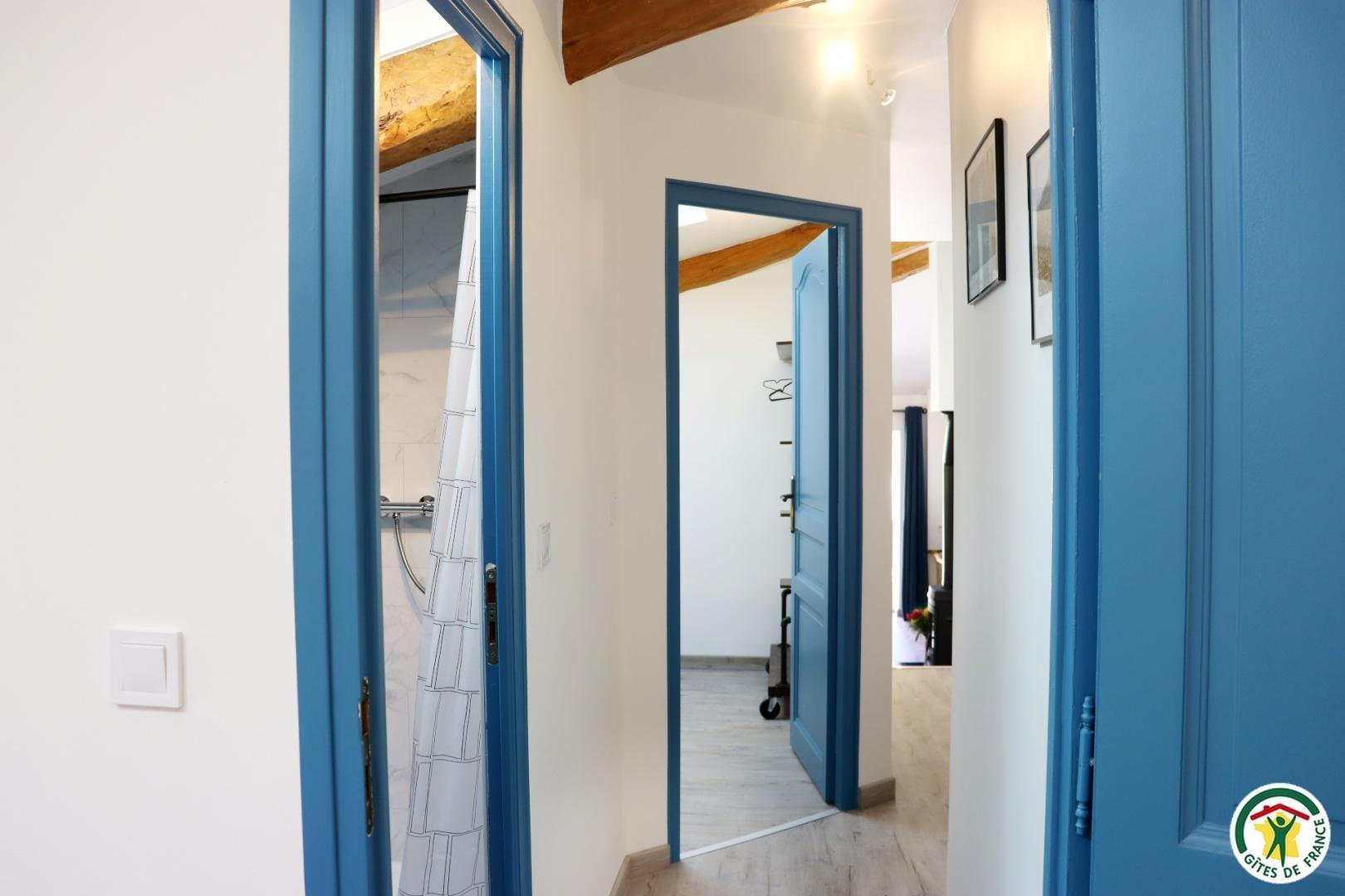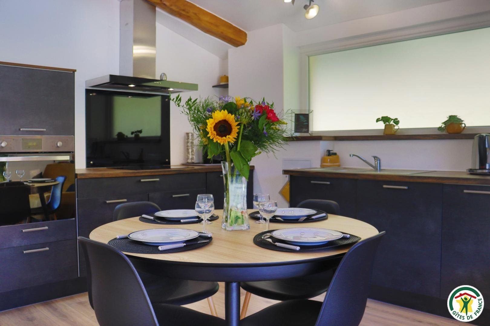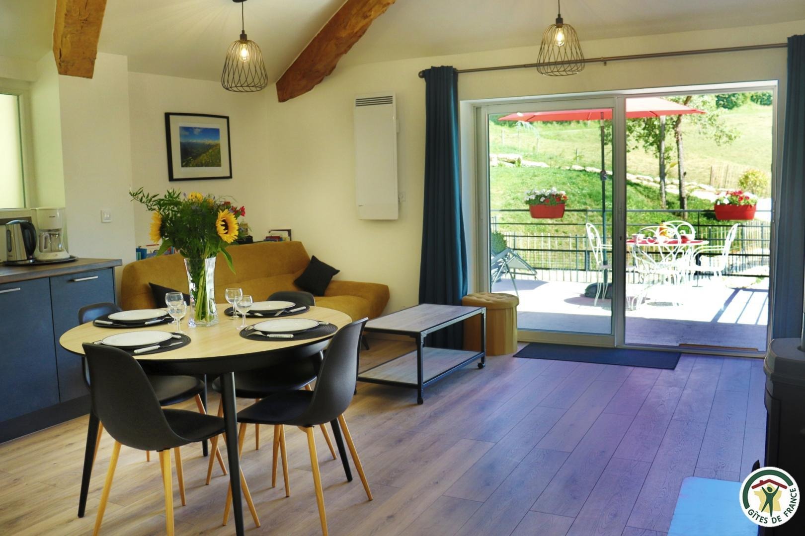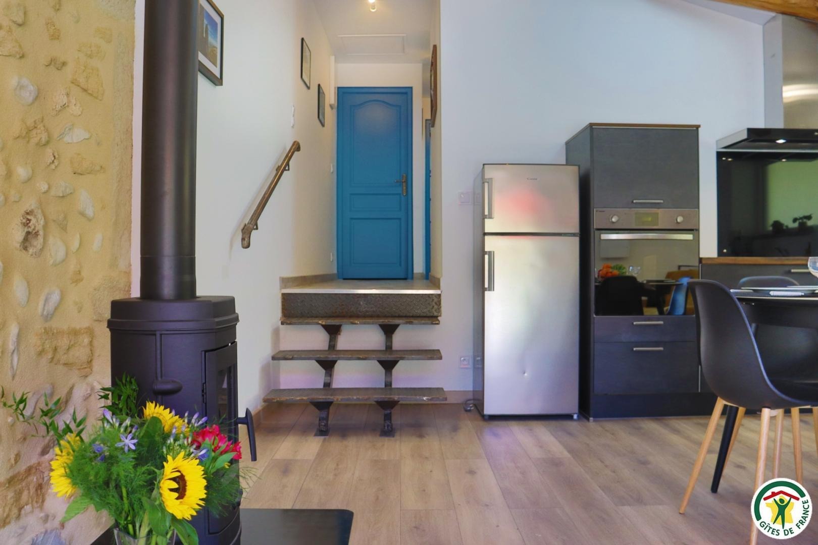 Appartement mitoyen par le côté à un futur gîte (travaux en cours), les propriétaires résident sur place. Entrée indépendante, stationnement sur place et terrain clos. Accès à l'hébergement par 3 marches et par un petit chemin jusqu'à la terrasse privative (salon de jardin, parasol, barbecue charbon). Entrée par la pièce à vivre dotée d'une cuisine équipée, d'un espace repas et d'un coin salon avec canapé, TV, poêle à bois. Une chambre avec un lit double (1x160) et une seconde chambre avec deux lits simples (2x90). Toutes deux disposent d'un velux et d'un rangement. Salle d'eau (douche italienne avec rideau, lavabo, sèche-serviette) et wc indépendant (sanibroyeur). La façade du gîte n'a pas encore été refaite, elle le sera en même temps que la façade du second gîte, en cours d'aménagement.