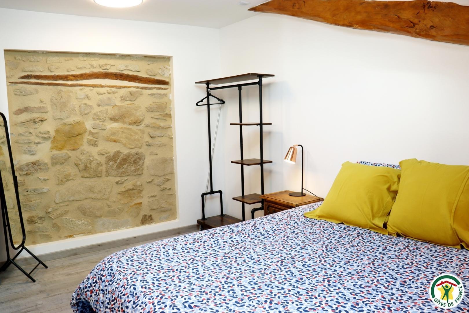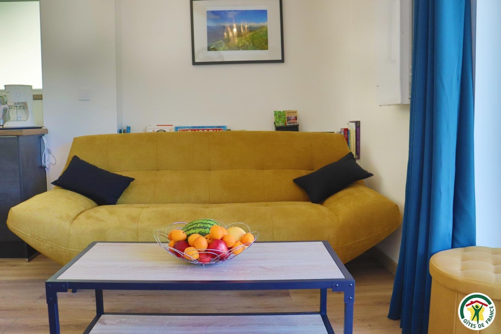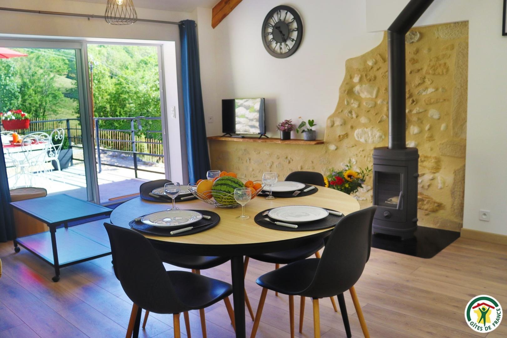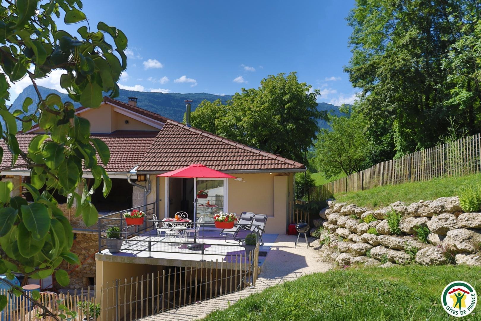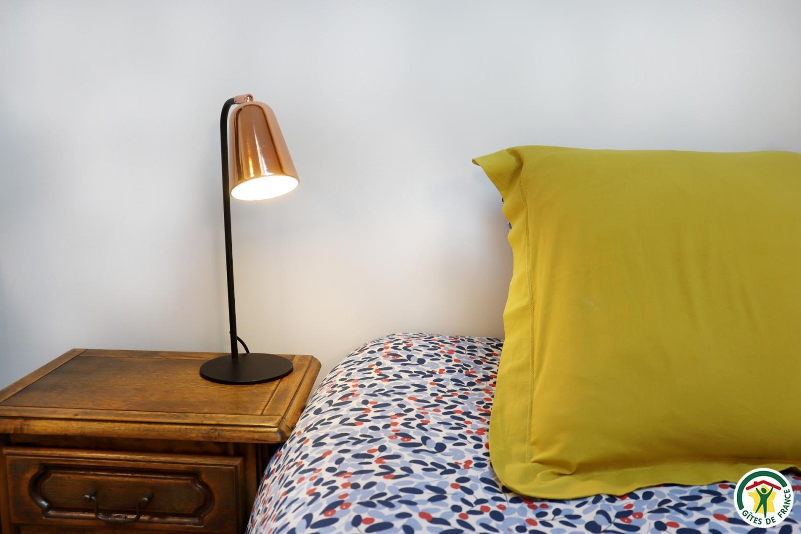Appartement mitoyen par le côté à un futur gîte (travaux en cours), les propriétaires résident sur place. Entrée indépendante, stationnement sur place et terrain clos. Accès à l'hébergement par 3 marches et par un petit chemin jusqu'à la terrasse privative (salon de jardin, parasol, barbecue charbon). Entrée par la pièce à vivre dotée d'une cuisine équipée, d'un espace repas et d'un coin salon avec canapé, TV, poêle à bois. Une chambre avec un lit double (1x160) et une seconde chambre avec deux lits simples (2x90). Toutes deux disposent d'un velux et d'un rangement. Salle d'eau (douche italienne avec rideau, lavabo, sèche-serviette) et wc indépendant (sanibroyeur). La façade du gîte n'a pas encore été refaite, elle le sera en même temps que la façade du second gîte, en cours d'aménagement.