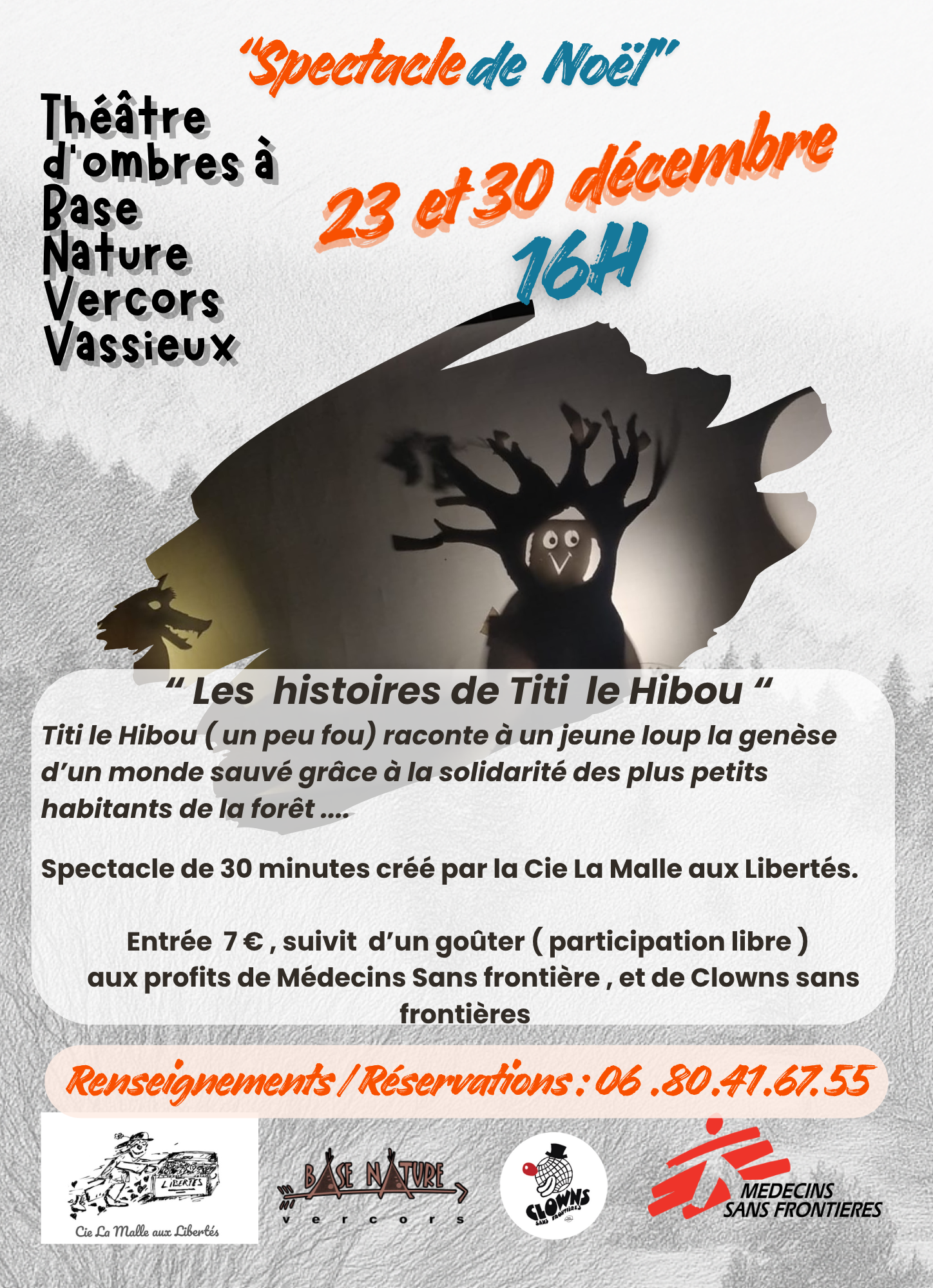 Bernard et Annette Julien, marionnettistes de la Compagnie "la malle aux libertés" (membre du collectif des marionnettistes AURA) vous propose un théâtre d'ombres, suivi d'un goûter, au coin du feu dans la grange de Base Nature Vercors.