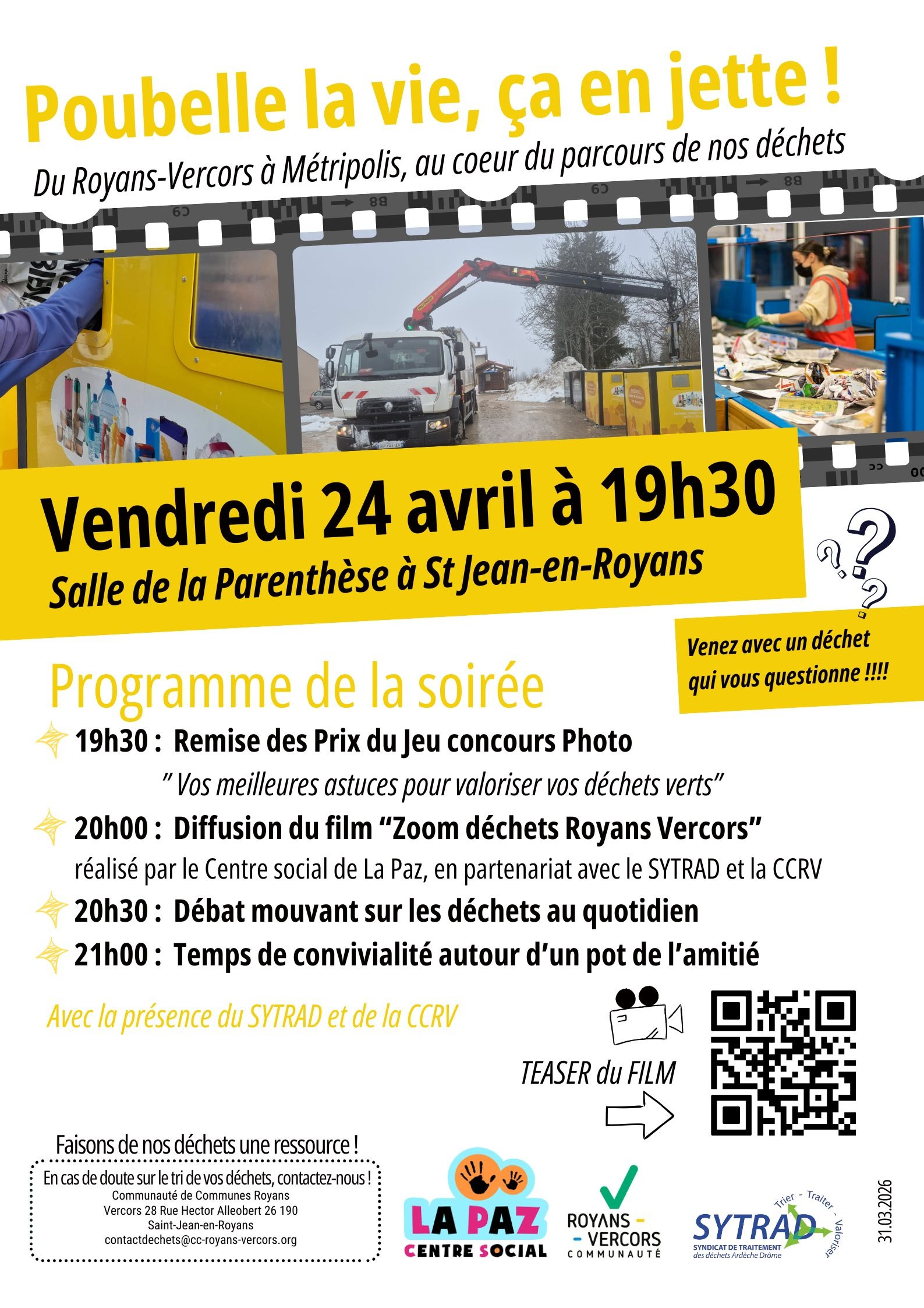 Le devenir de vos déchets vous questionne ? Le Centre Social La Paz et la CCRV vous propose, vendredi 24 avril à partir de 19h30 un ciné, débat et temps convivial autour de ce thème. Au programme :