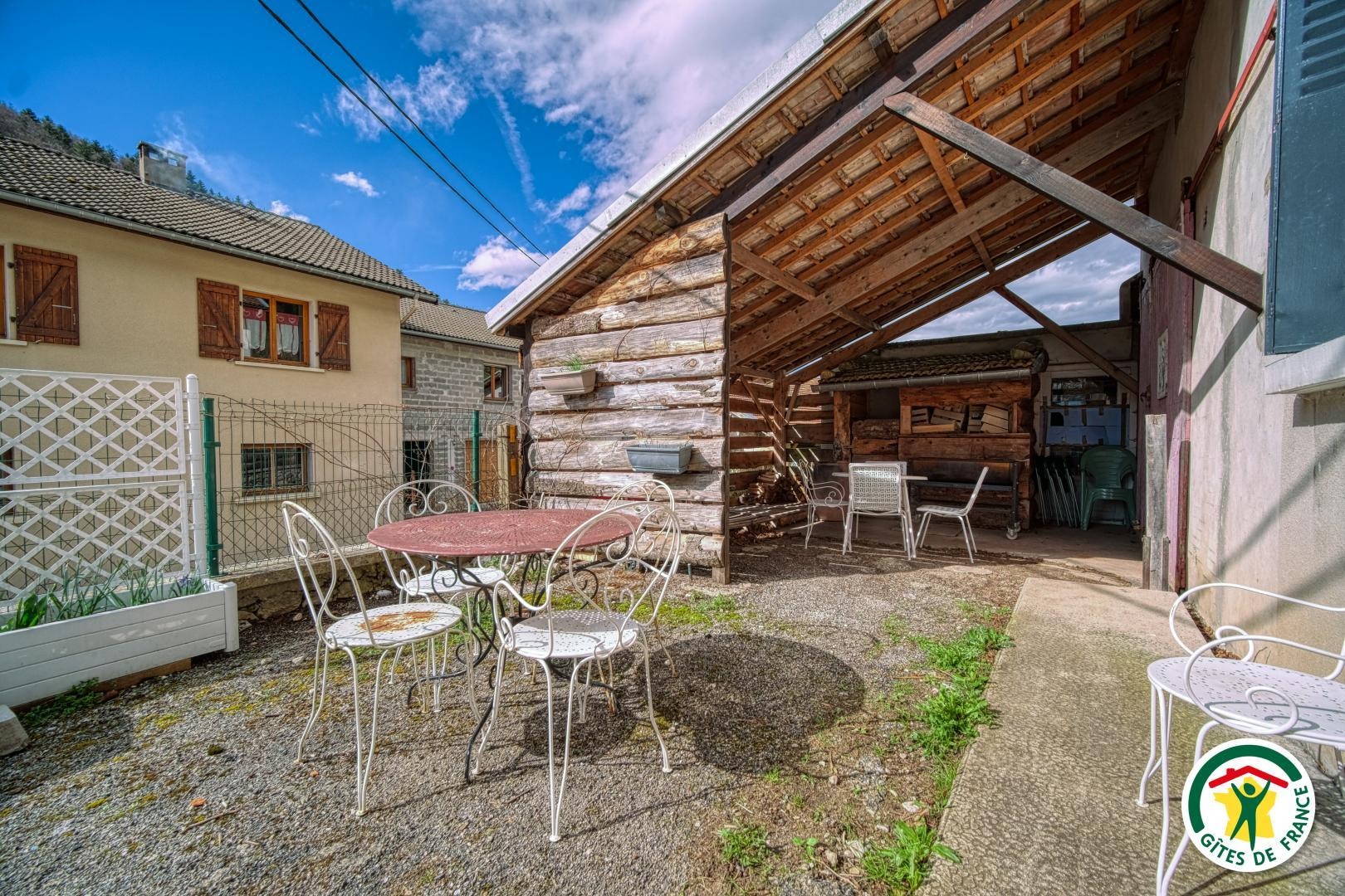 Terrasse et abris devant le gîtes ( 50m2) table et barbecue