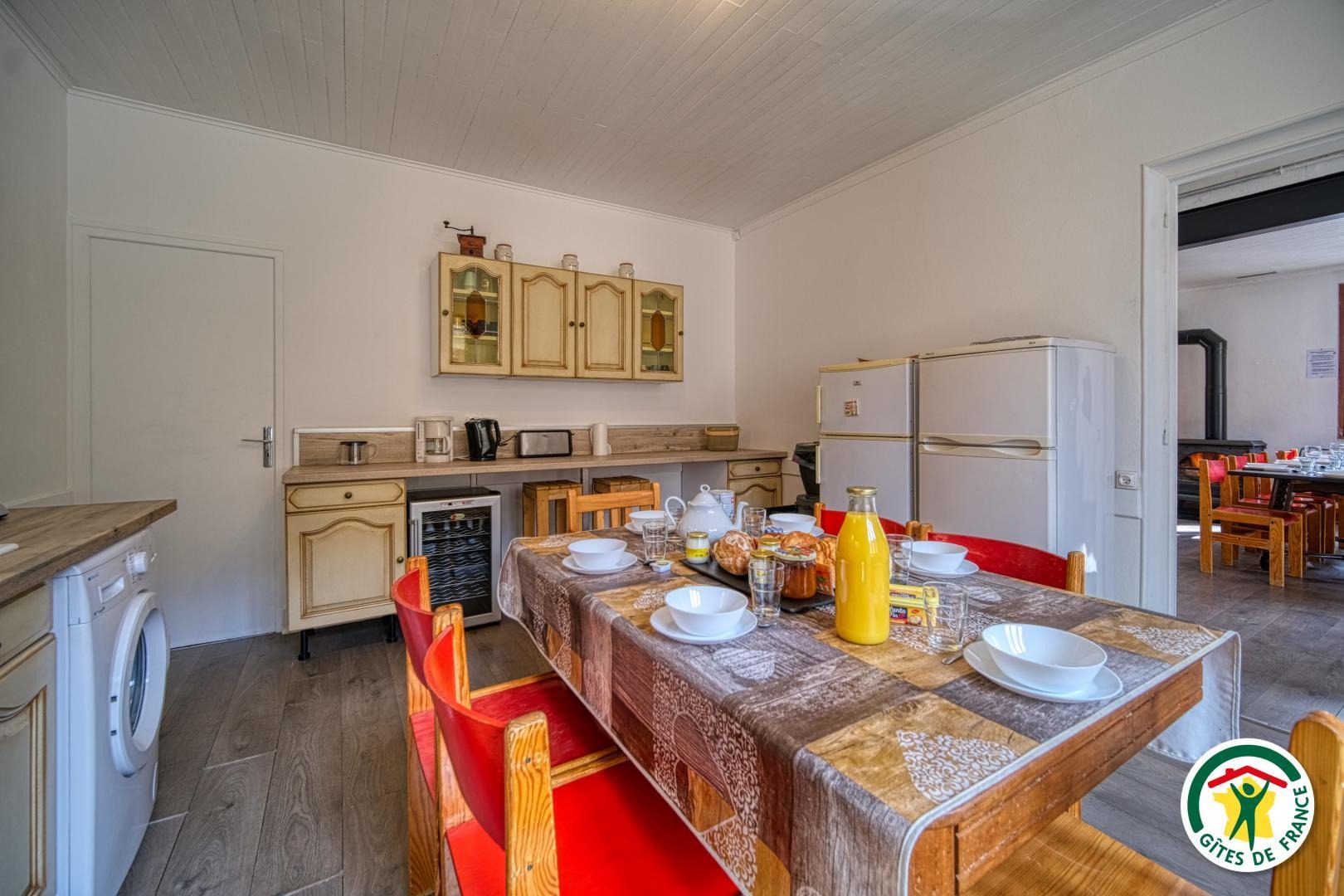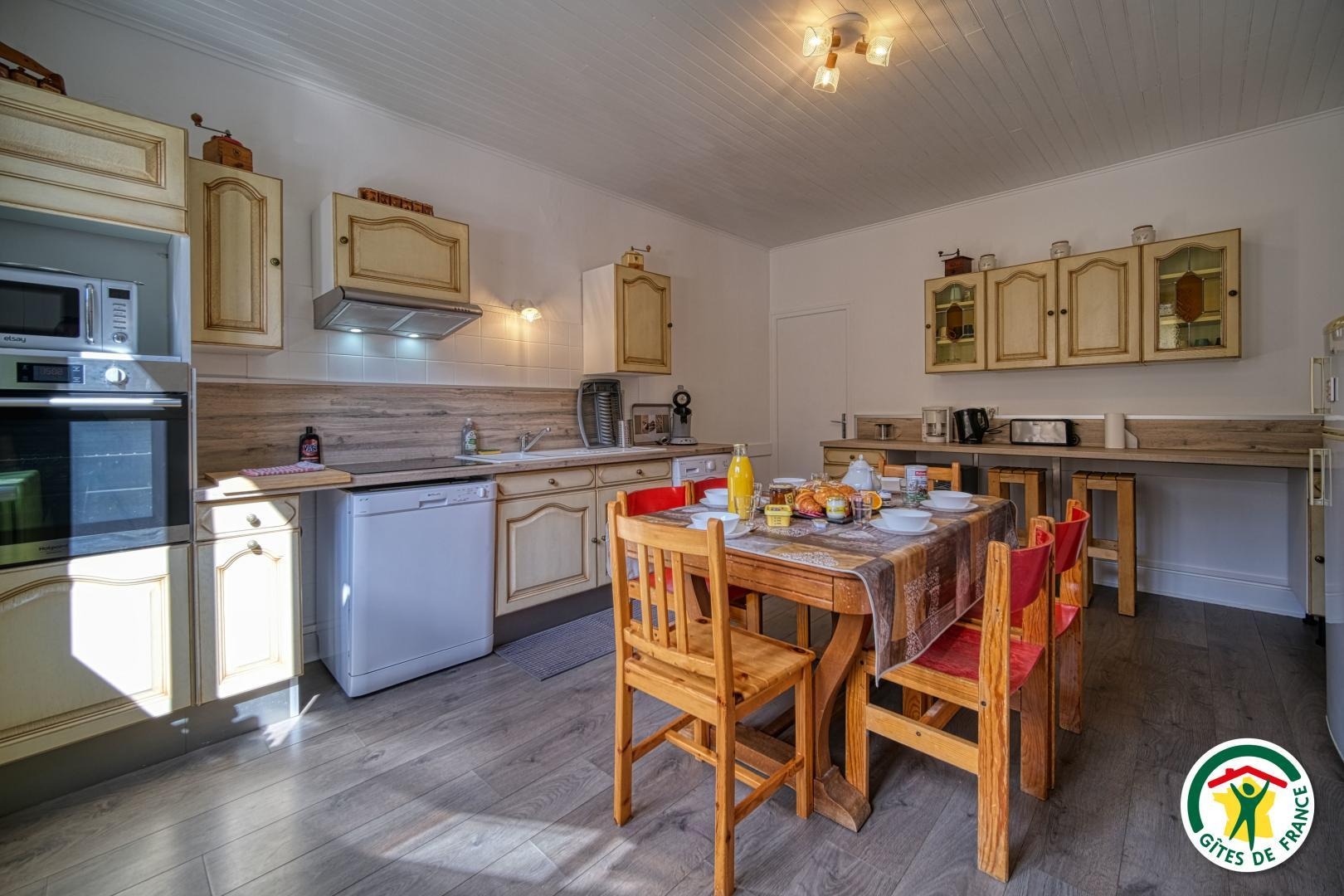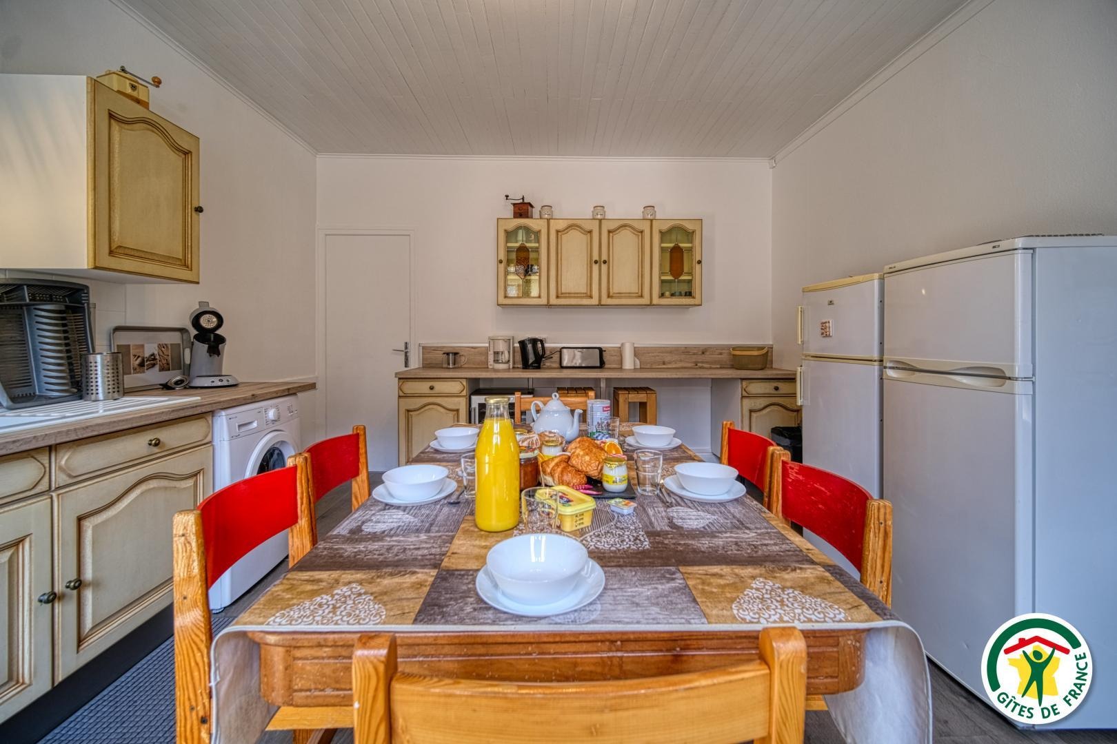 1 cuisine équipée ( four et plaque électrique, machine à laver, lave vaisselle, micro onde, cafetière à filtre…)