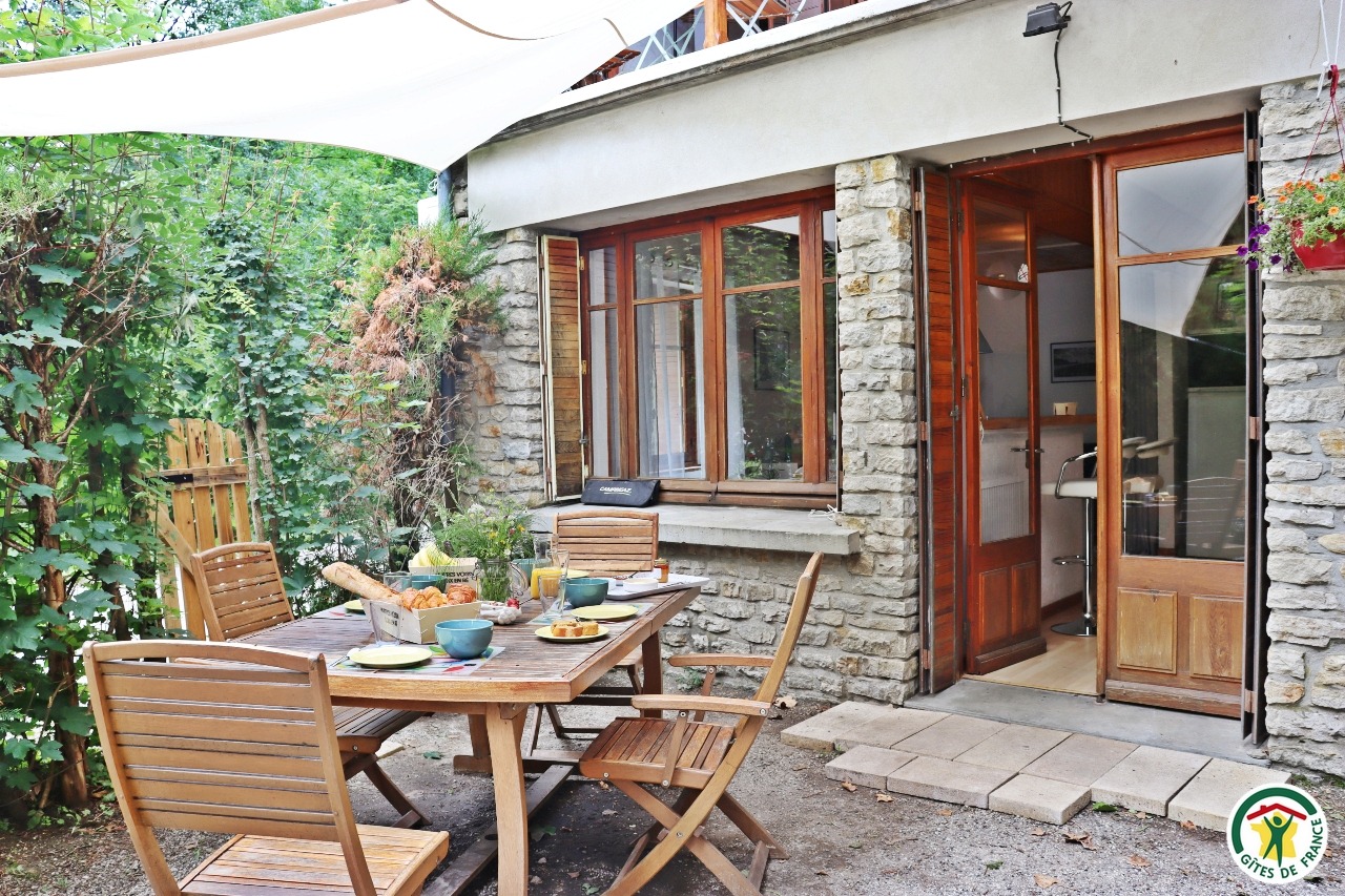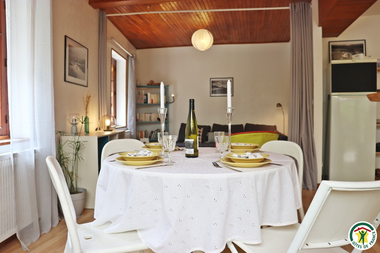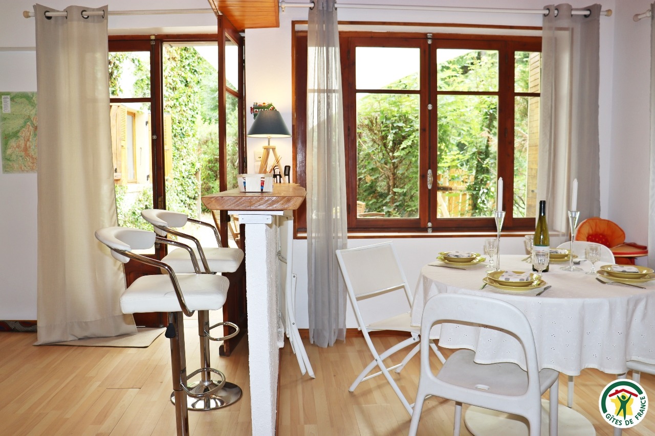 Gîte mitoyen à l'habitation des propriétaires avec entrée indépendante. Rez-de-chaussée : cuisine ouverte sur le séjour, espace repas et coin salon (canapé convertible 1x140), TV, fauteuil, salle d'eau/WC (douche rideau). A l'étage : salle d'eau/WC (douche rideau) et trois chambres. La première chambre dispose de deux lits simples ou d'un lit double (2x80 ou 1x160), la deuxième chambre d'un lit double (1x160) et accès à un balcon, la troisième chambre, plus petite, dispose de deux lits simples dont un lit superposé (2x90). Depuis la pièce à vivre du rez-de-chaussée, accès à la terrasse avec salon de jardin, barbecue charbon de bois, l'espace est clos avec deux portillons. En traversant la route (peu passante), terrain en herbe à partager avec les propriétaires : table de pique-nique, bains de soleil et accès rivière pour la baignade. 2 à 3 places de stationnement sur la propriété. A proximité de la D103.