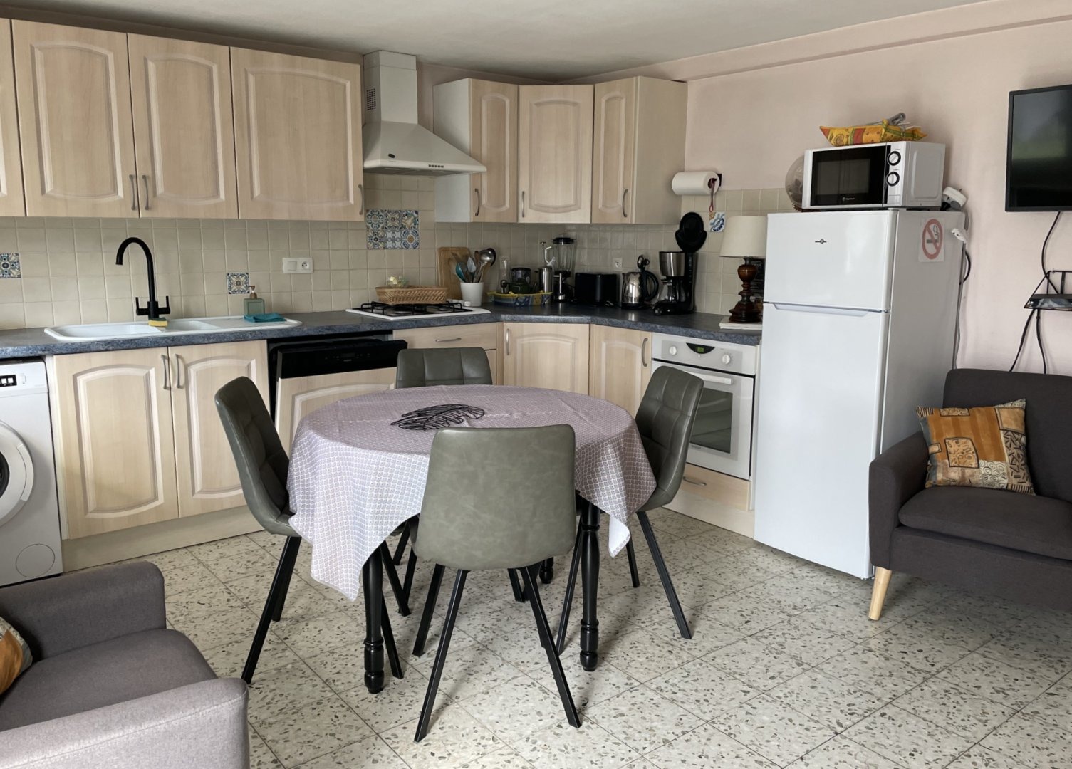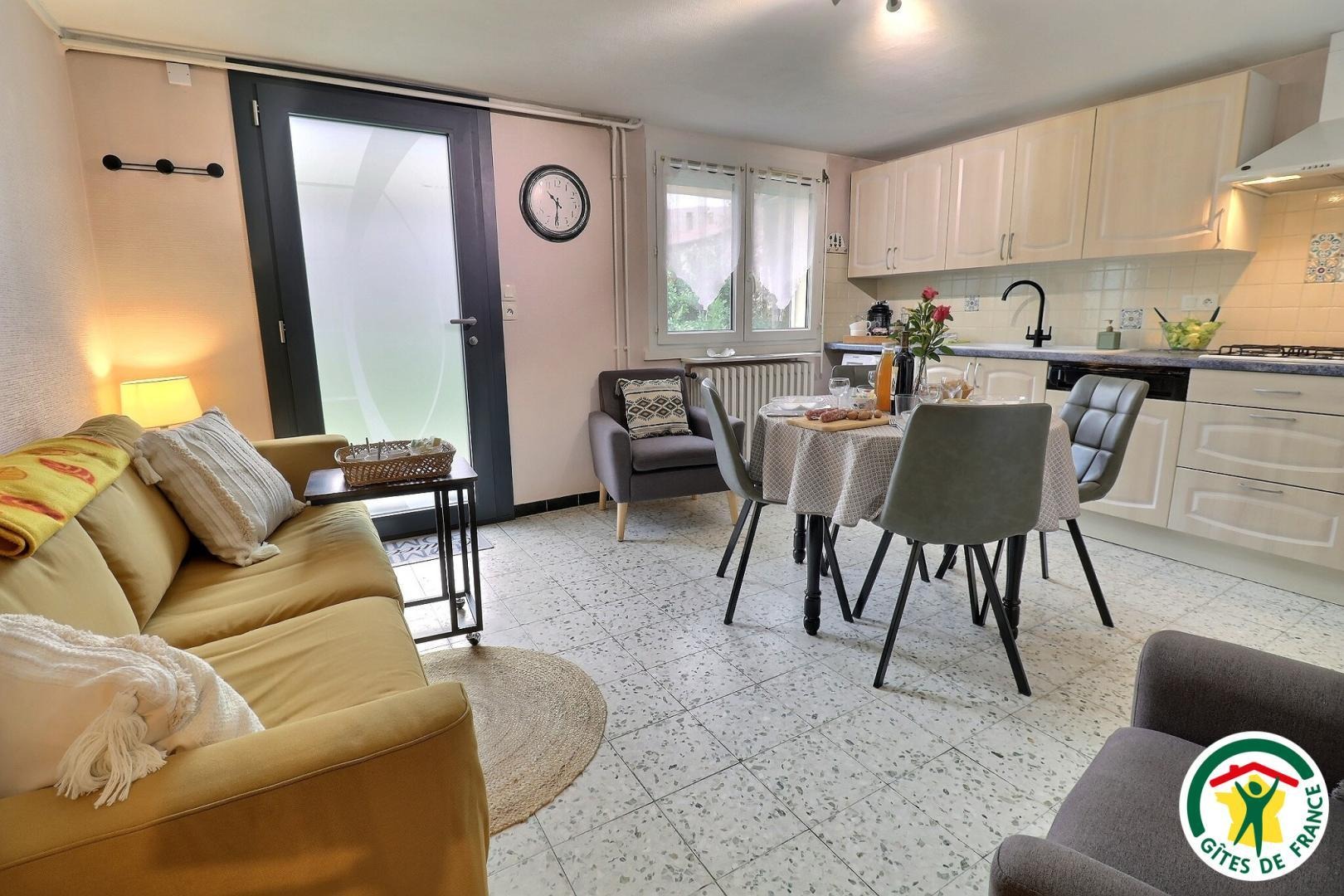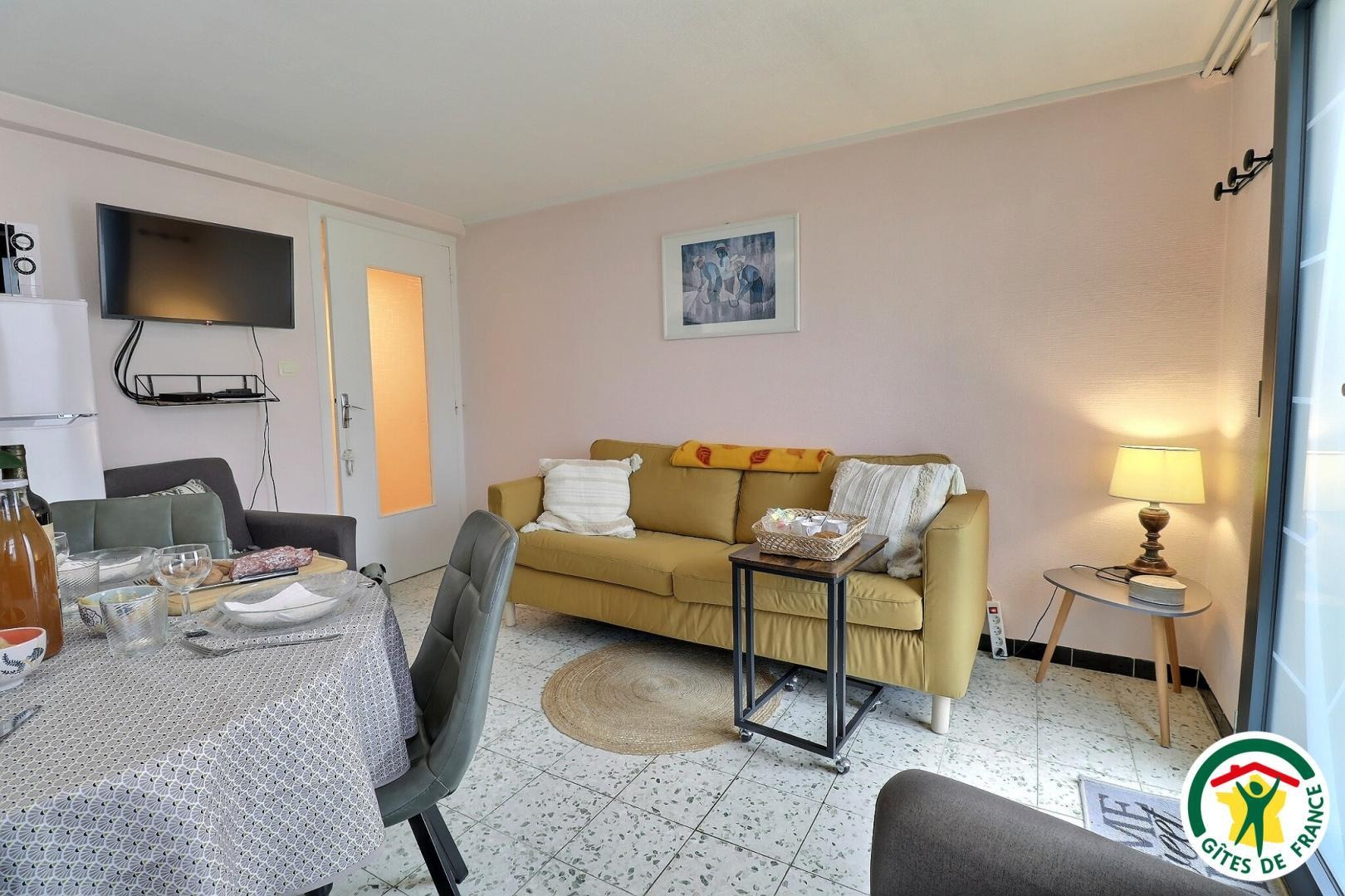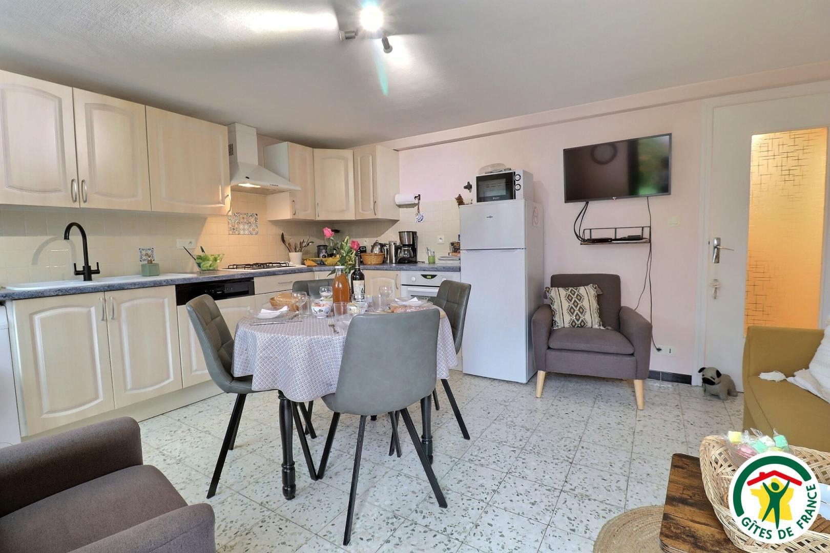 La pièce de vie comprend une cuisine équipée et fonctionnelle, un coin salon avec TV, Wi-Fi, Netflix et box.