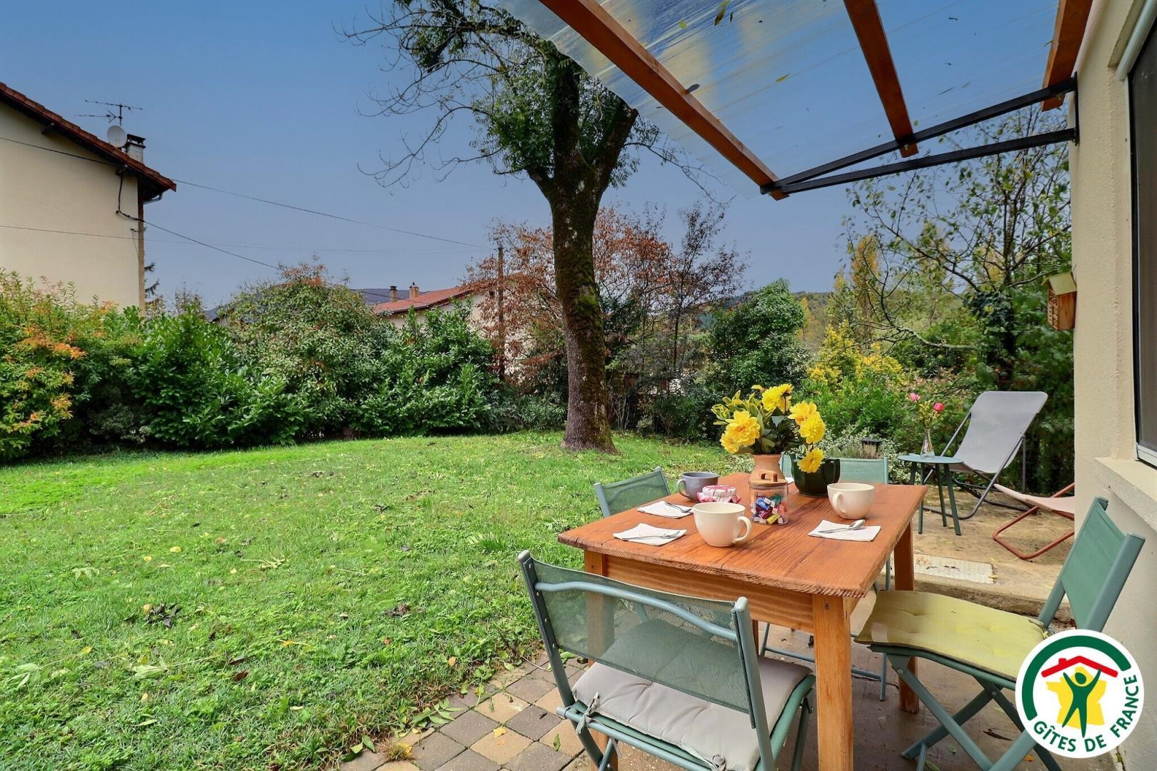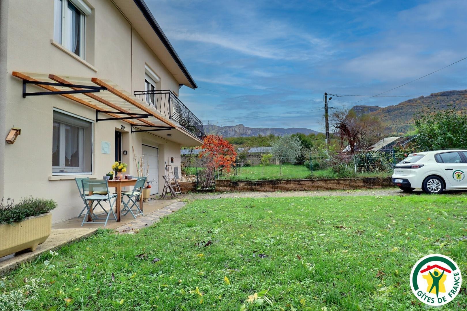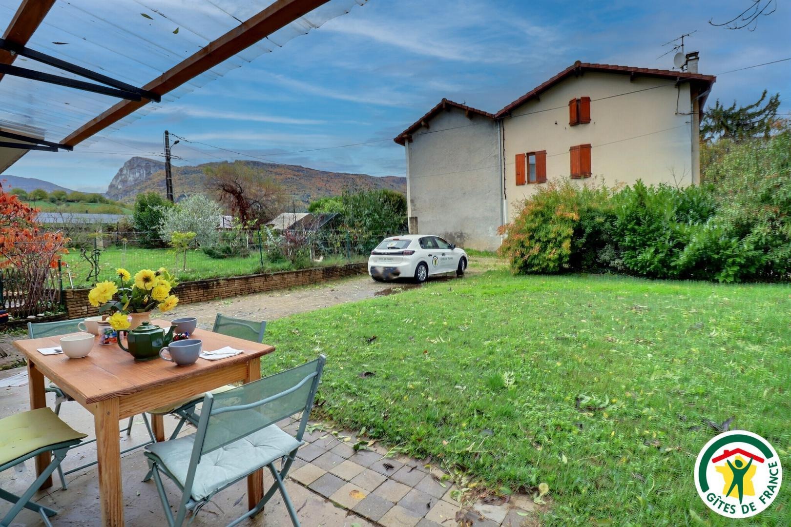 À l’extérieur, profitez d’un espace arboré sous un frêne, avec terrasse pour les repas, barbecue, chaises longues et vue sur la montagne.