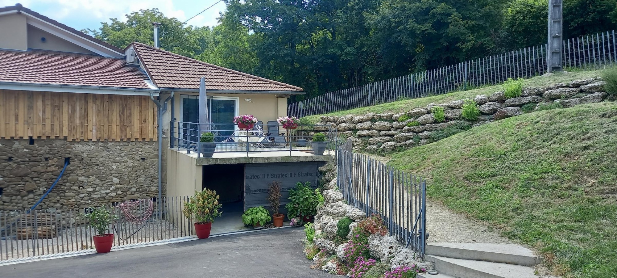 Appartement mitoyen par le côté à un futur gîte (travaux en cours), les propriétaires résident sur place. Entrée indépendante, stationnement sur place et terrain clos. Accès à l'hébergement par 3 marches et par un petit chemin jusqu'à la terrasse privative (salon de jardin, parasol, barbecue charbon). Entrée par la pièce à vivre dotée d'une cuisine équipée, d'un espace repas et d'un coin salon avec canapé, TV, poêle à bois. Une chambre avec un lit double (1x160) et une seconde chambre avec deux lits simples (2x90). Toutes deux disposent d'un velux et d'un rangement. Salle d'eau (douche italienne avec rideau, lavabo, sèche-serviette) et wc indépendant (sanibroyeur). La façade du gîte n'a pas encore été refaite, elle le sera en même temps que la façade du second gîte, en cours d'aménagement.