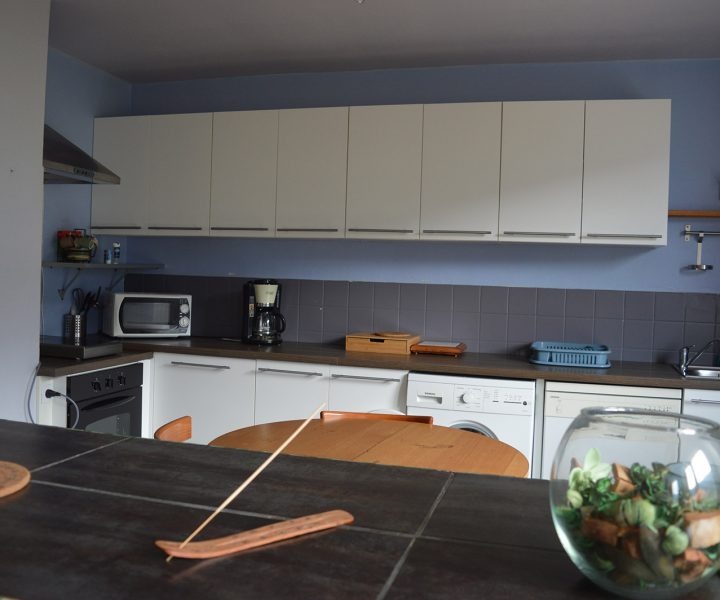 Cuisine ouverte avec réfrigérateur, plaque gaz 4 feux, four, micro-ondes et vaisselle complète