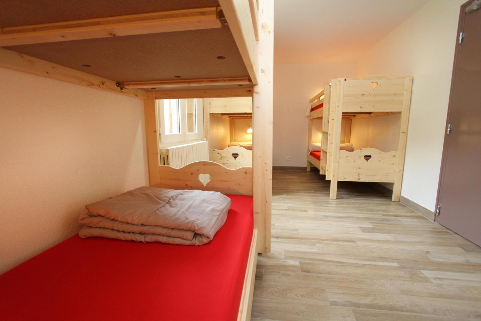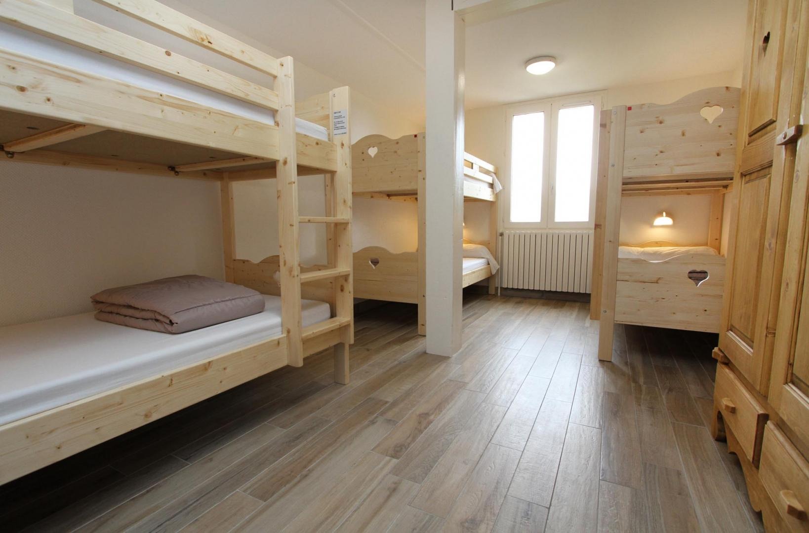 et un dortoir de 8 sur 2 niveaux bien séparés visuellement mais sans porte.