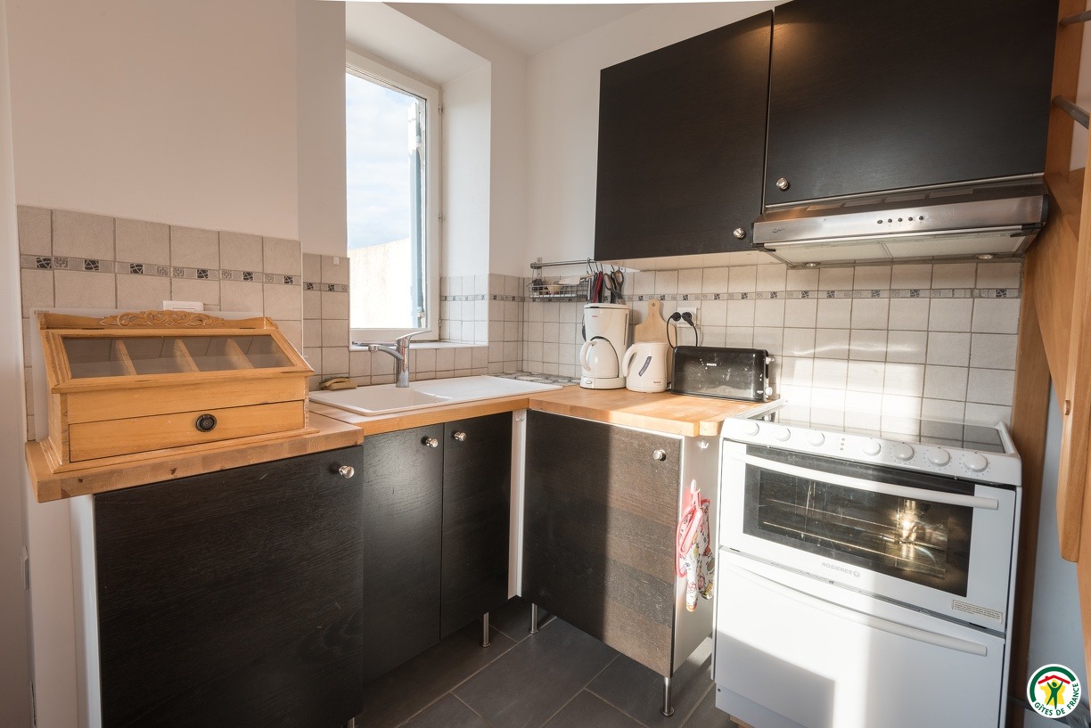 Situé à l'étage, mitoyen à la maison des propriétaires, sans vis-à-vis avec entrée indépendante. 1er étage : cuisine équipée/salon (canapé BZ), wc. 2ème étage : 2 chambres (2x90 ou 1x180)(2x90), salle d'eau/wc. Le gîte dispose d'une grande terrasse privative et profite du jardin arboré. Abri vélo. Parking à proximité.