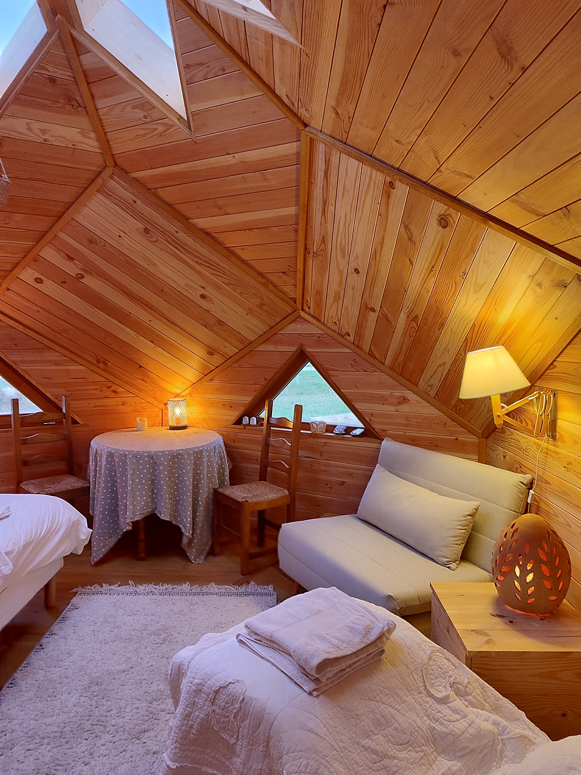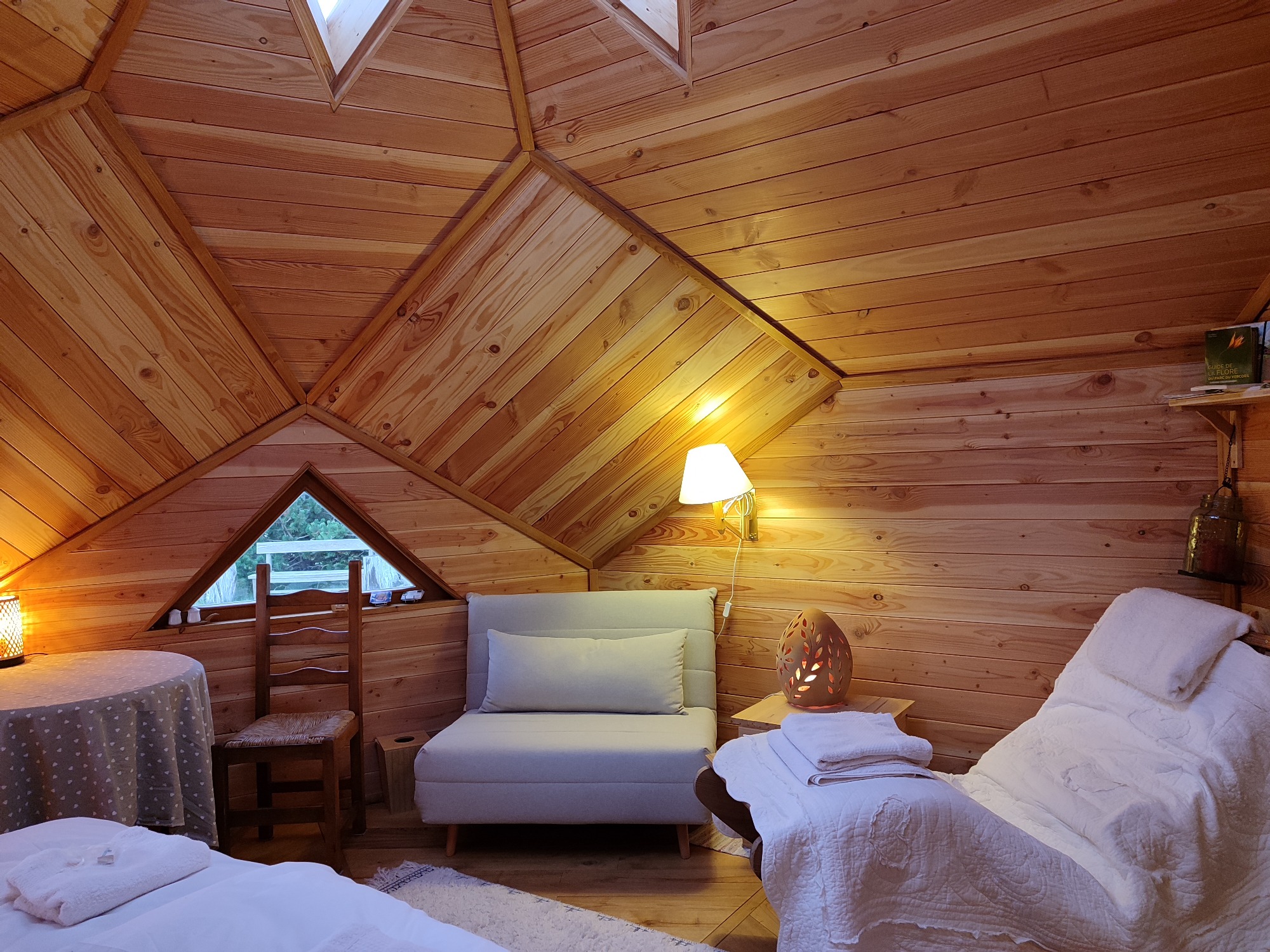 Une chambre pour deux, atypique, sous les étoiles, près de notre chalet en rondins, nous vous accueillons, pour une nuit, un weekend , un séjour. Petit déjeuner inclus, repas du soir sur commande, en chambre ou sur la terrasse - Salle de bain, toilettes et petit sauna privatifs dans le chalet.