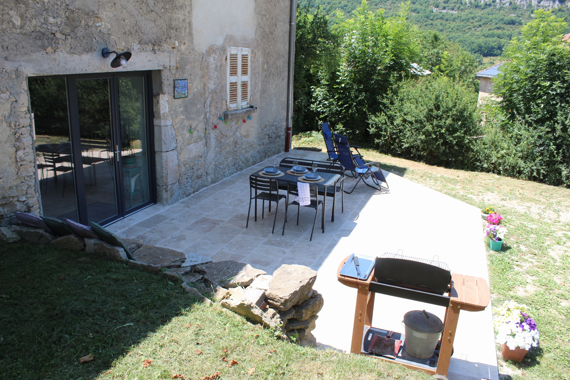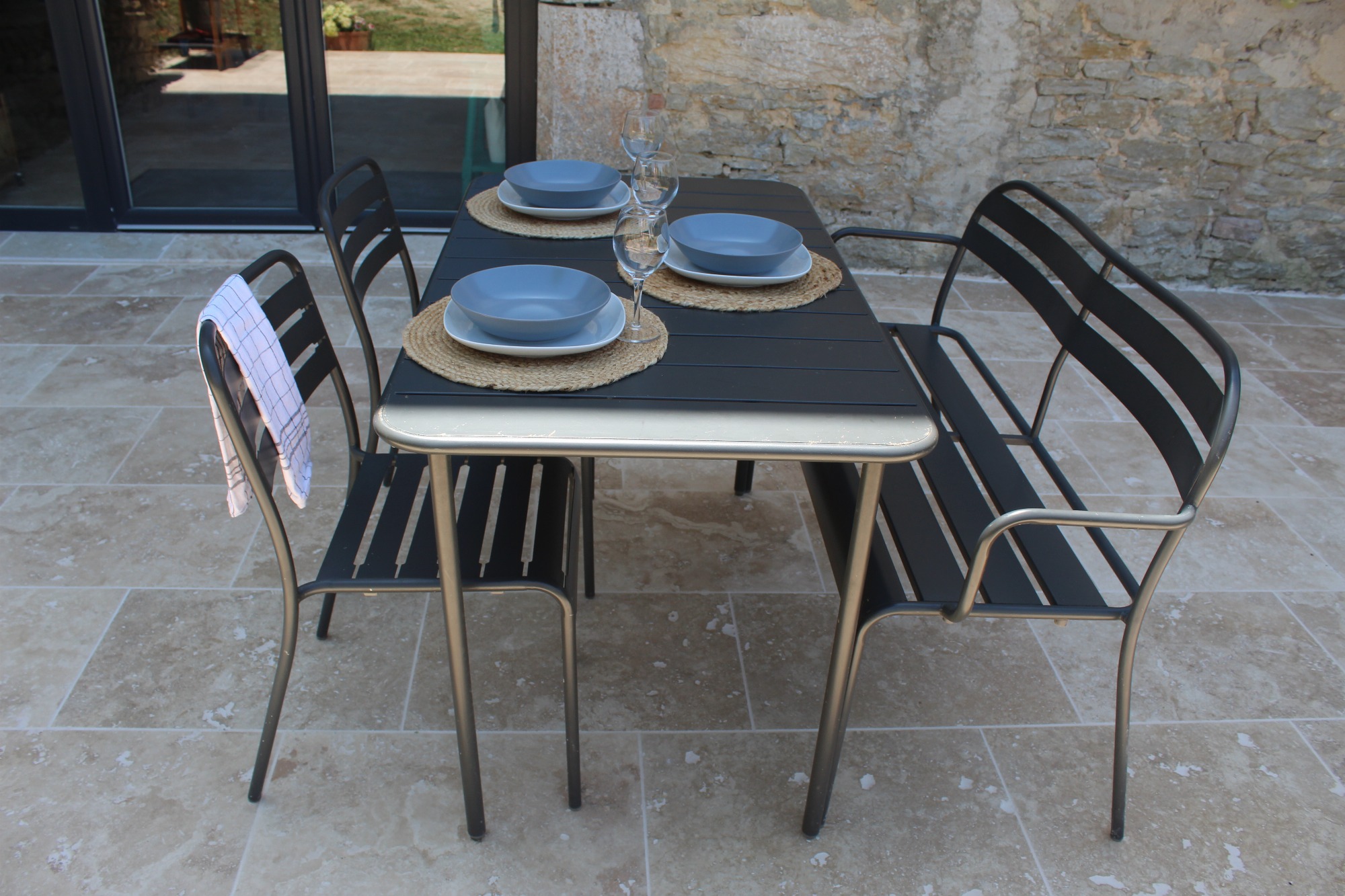 -Une grande terrasse carrelée (réalisée en 2025), avec table, transats, barbecue, etc.