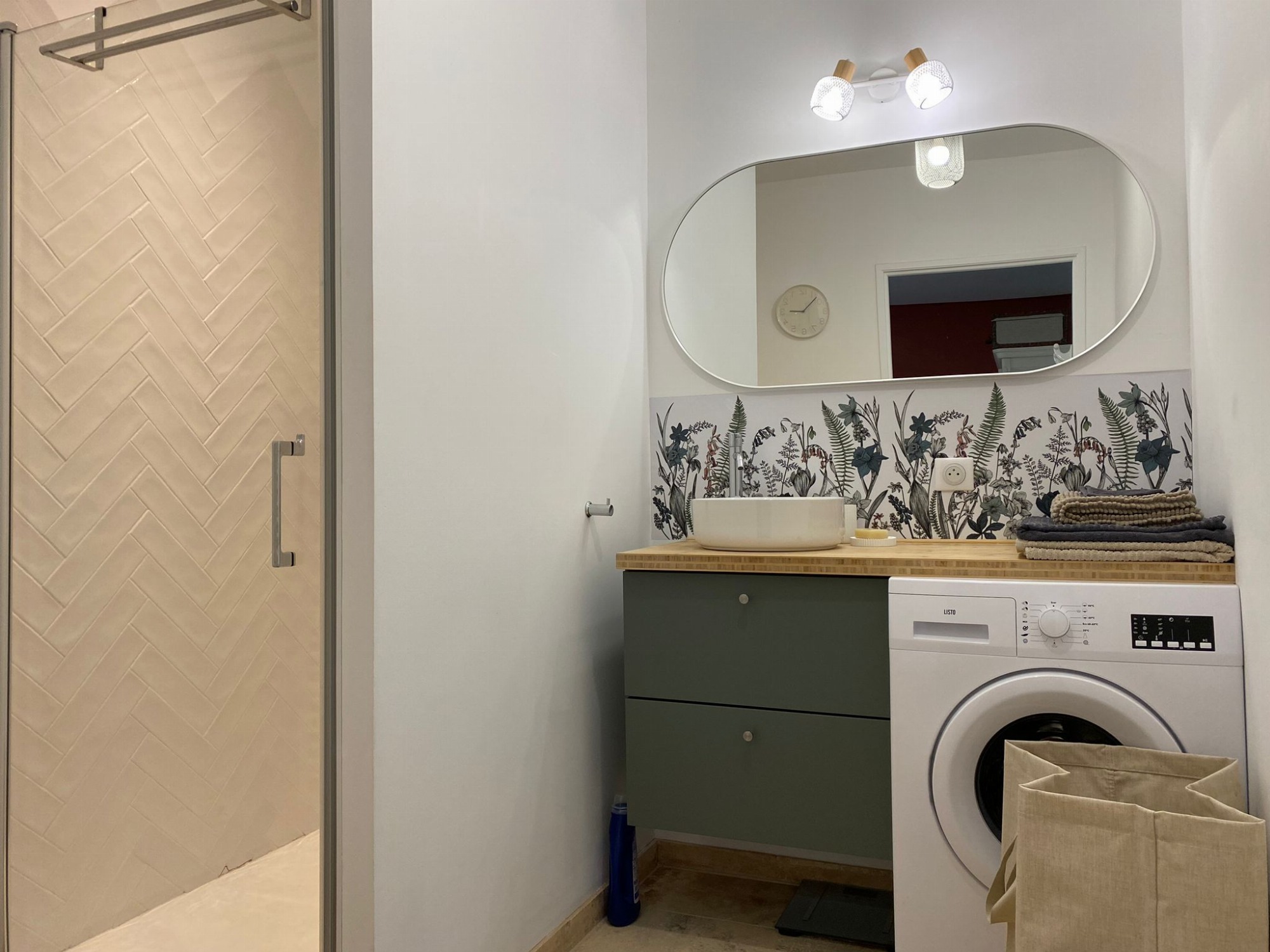 -Une salle de bain équipée d’une douche et d’un lave-linge