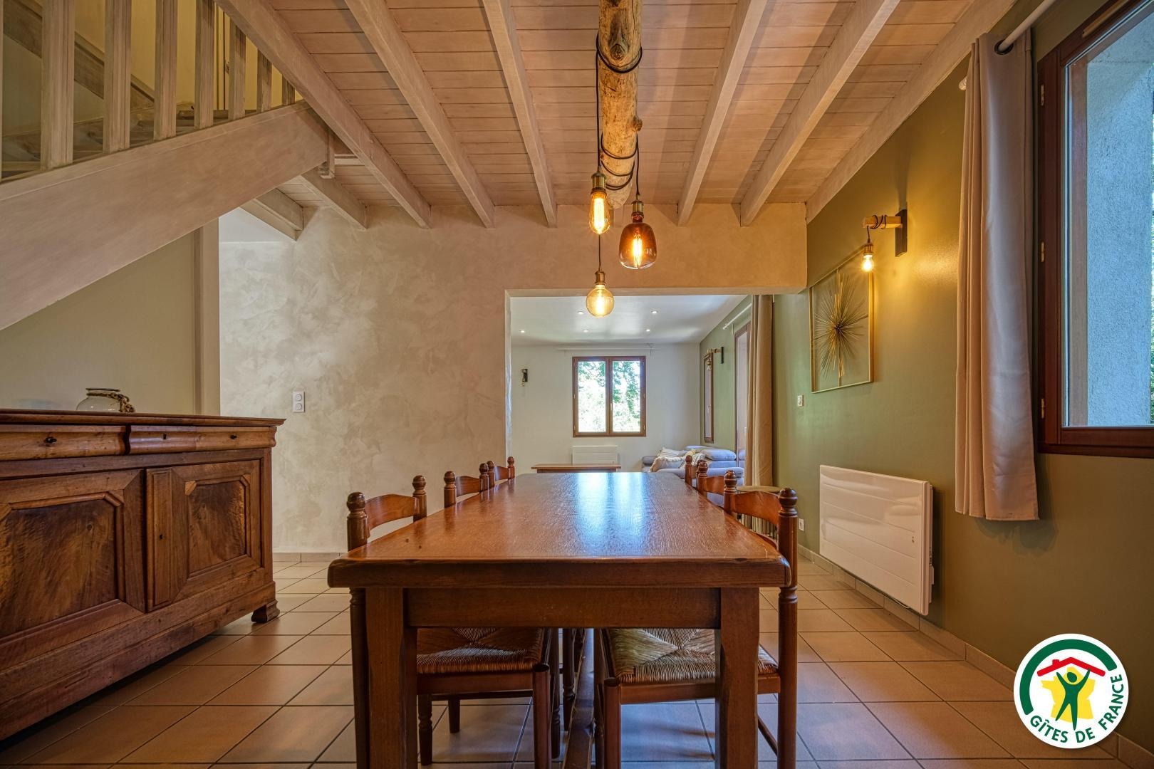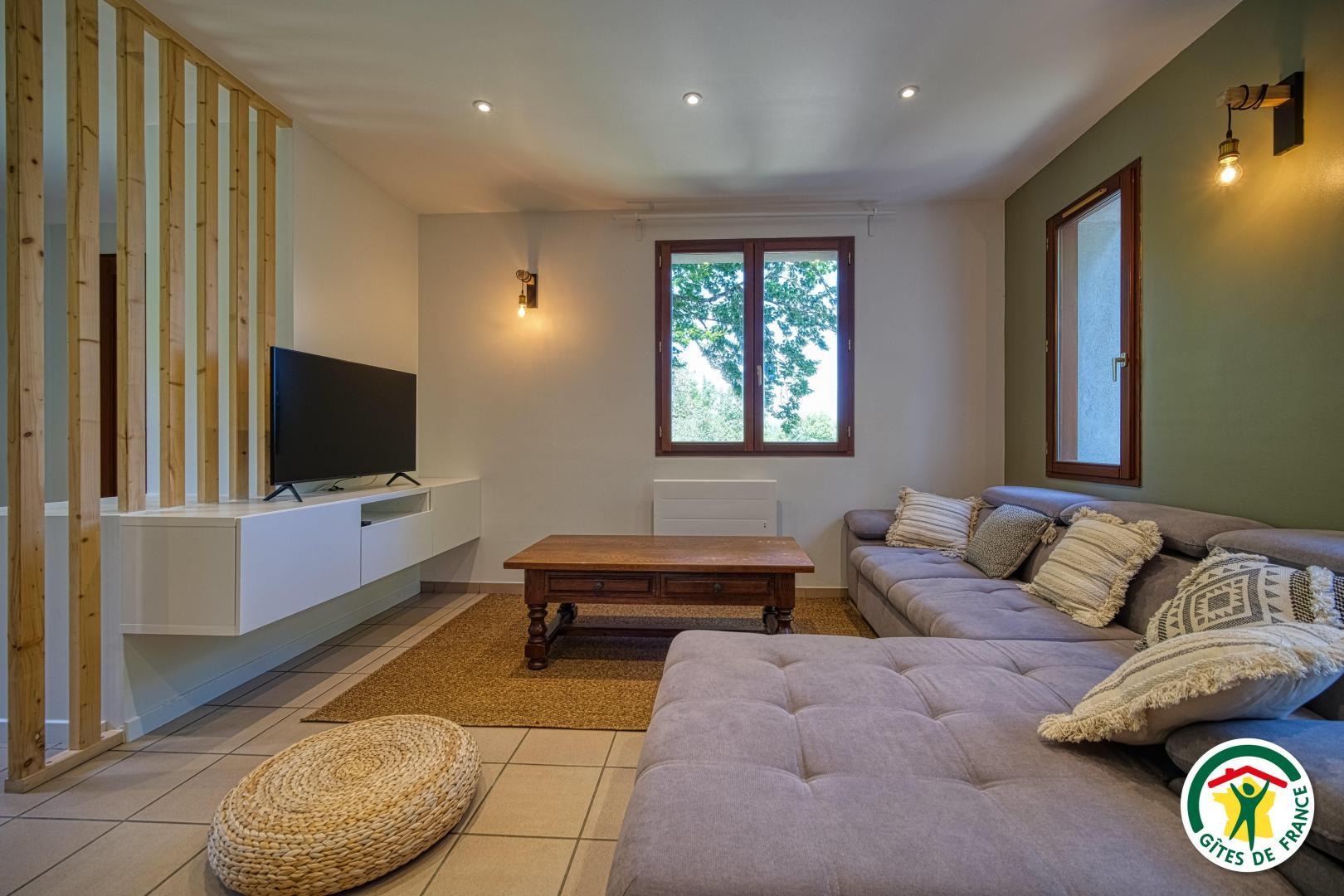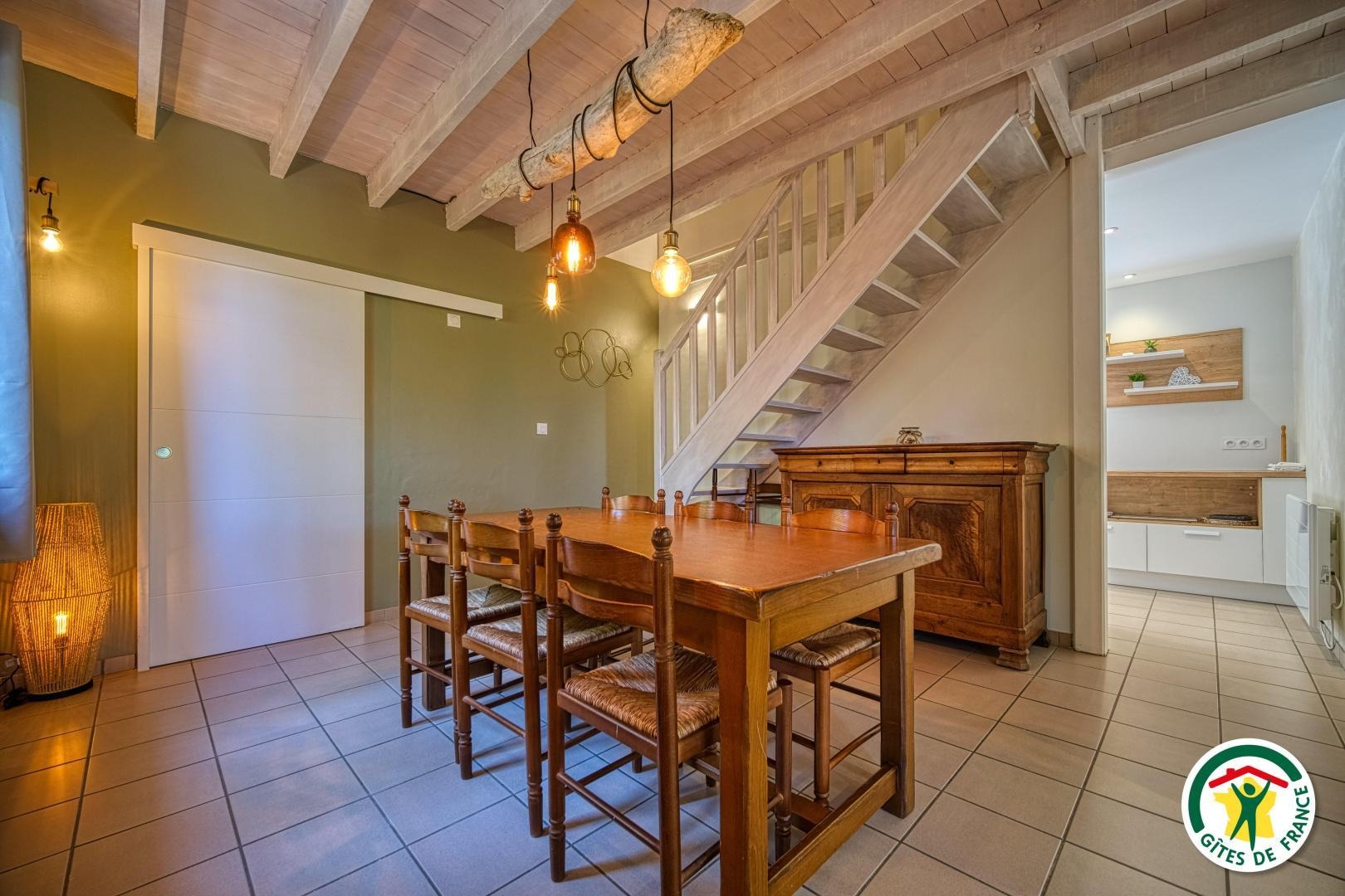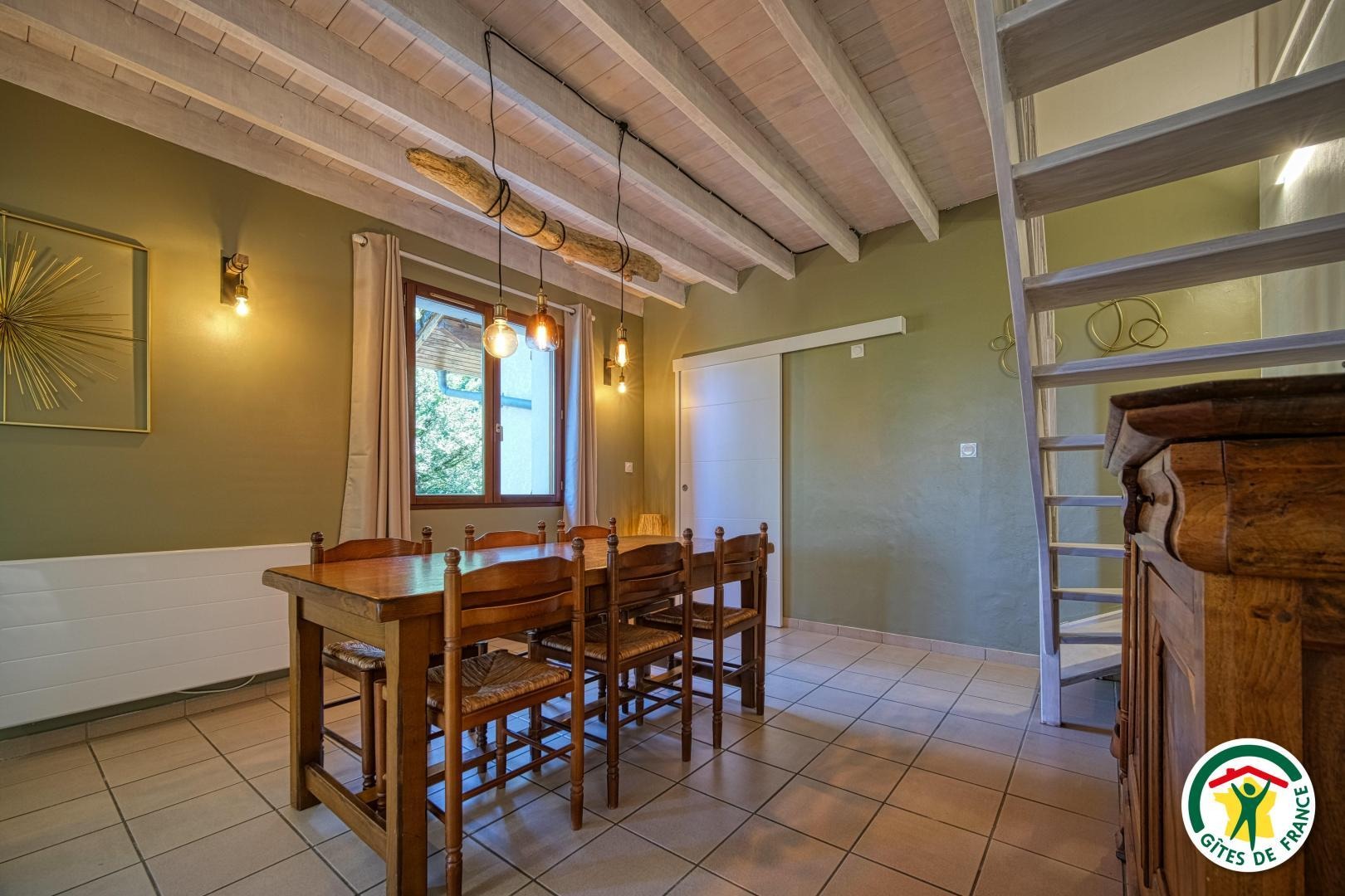 Vous accéderez au gîte par un sentier en terre, et l'entrée se fait par un escalier extérieur. En ouvrant la porte, vous découvrirez un grand salon avec un canapé convertible et TV, ouvert sur la salle à manger. La cuisine, entièrement équipée et située à proximité, dispose également d'un accès à la terrasse.