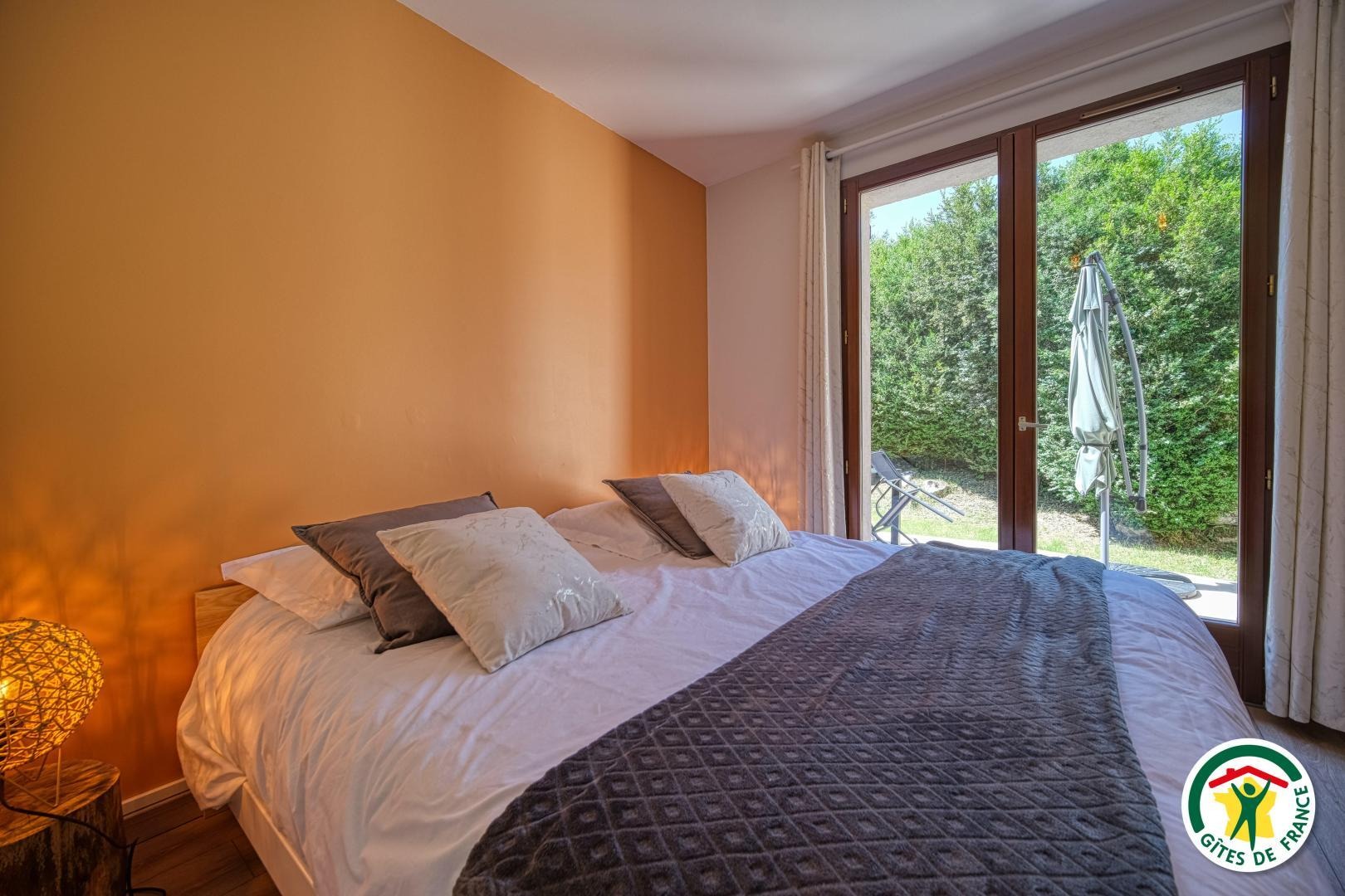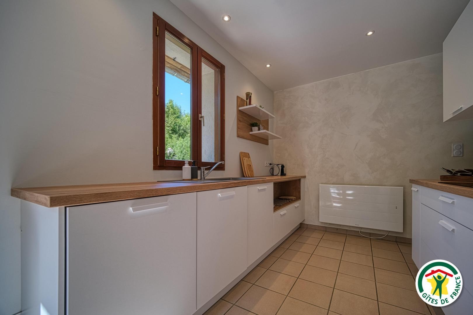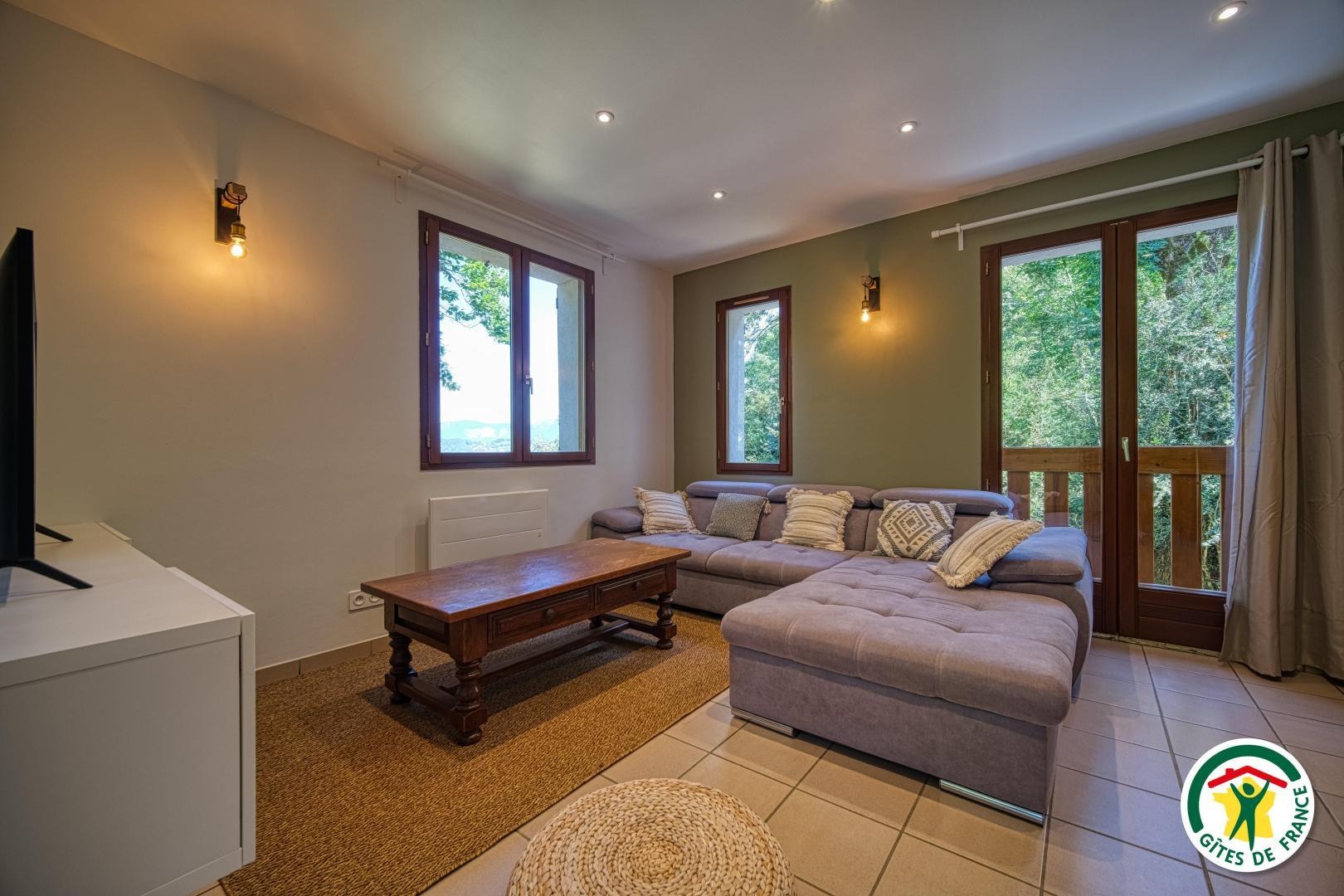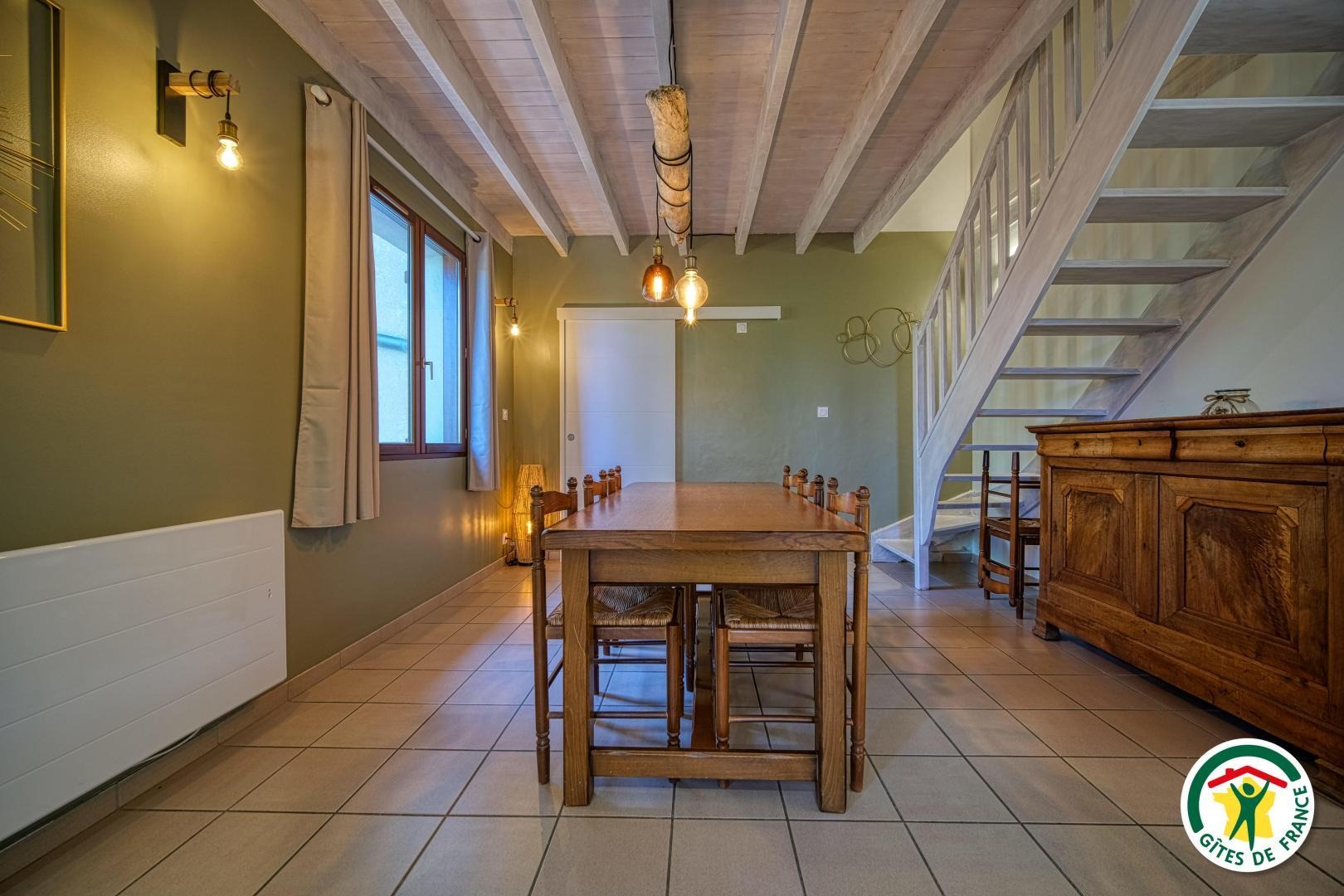 Vous accéderez au gîte par un sentier en terre, et l'entrée se fait par un escalier extérieur. En ouvrant la porte, vous découvrirez un grand salon avec un canapé convertible et TV, ouvert sur la salle à manger. La cuisine, entièrement équipée et située à proximité, dispose également d'un accès à la terrasse.