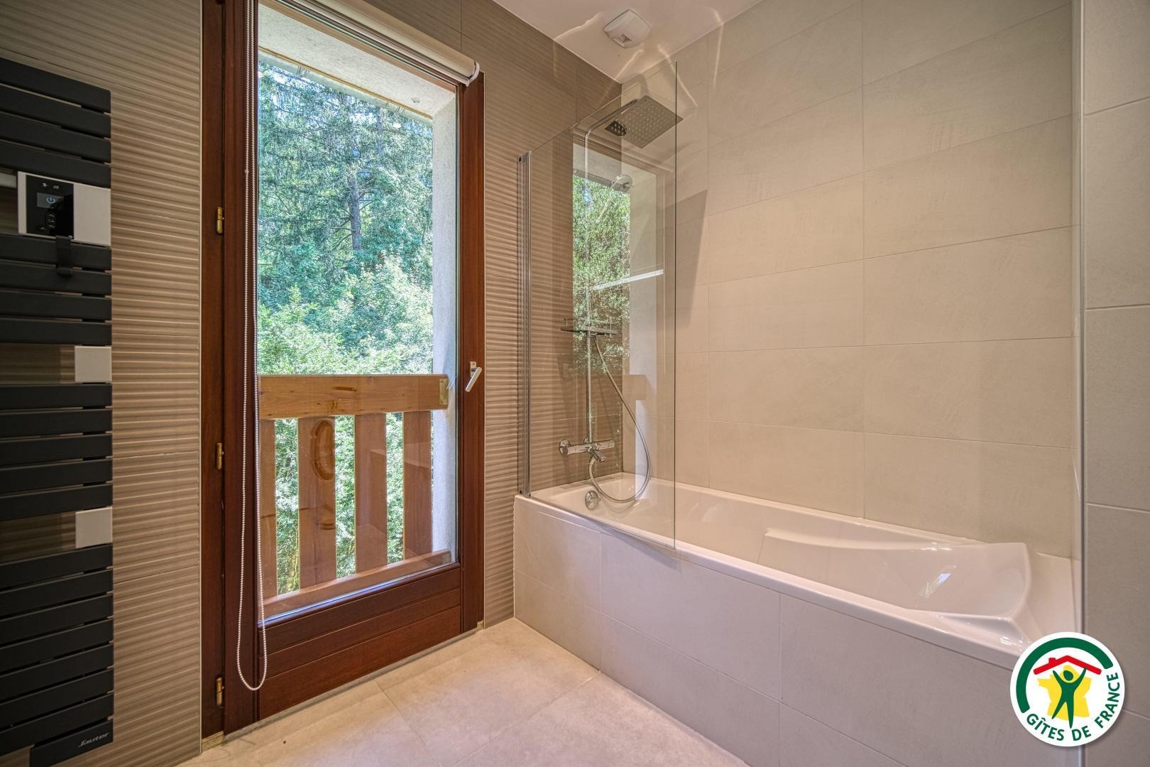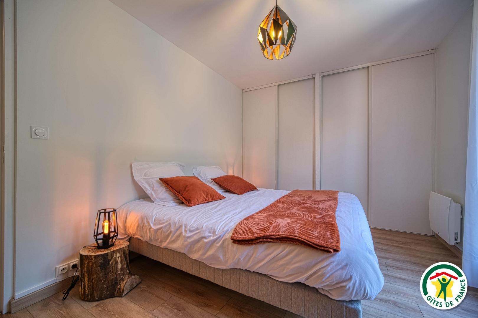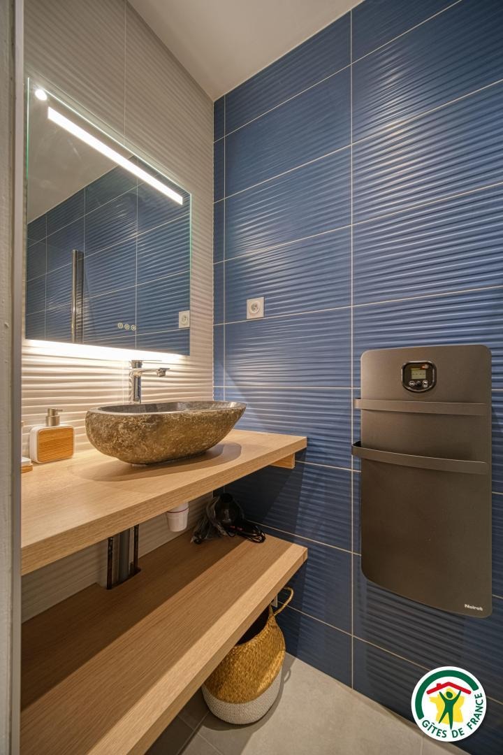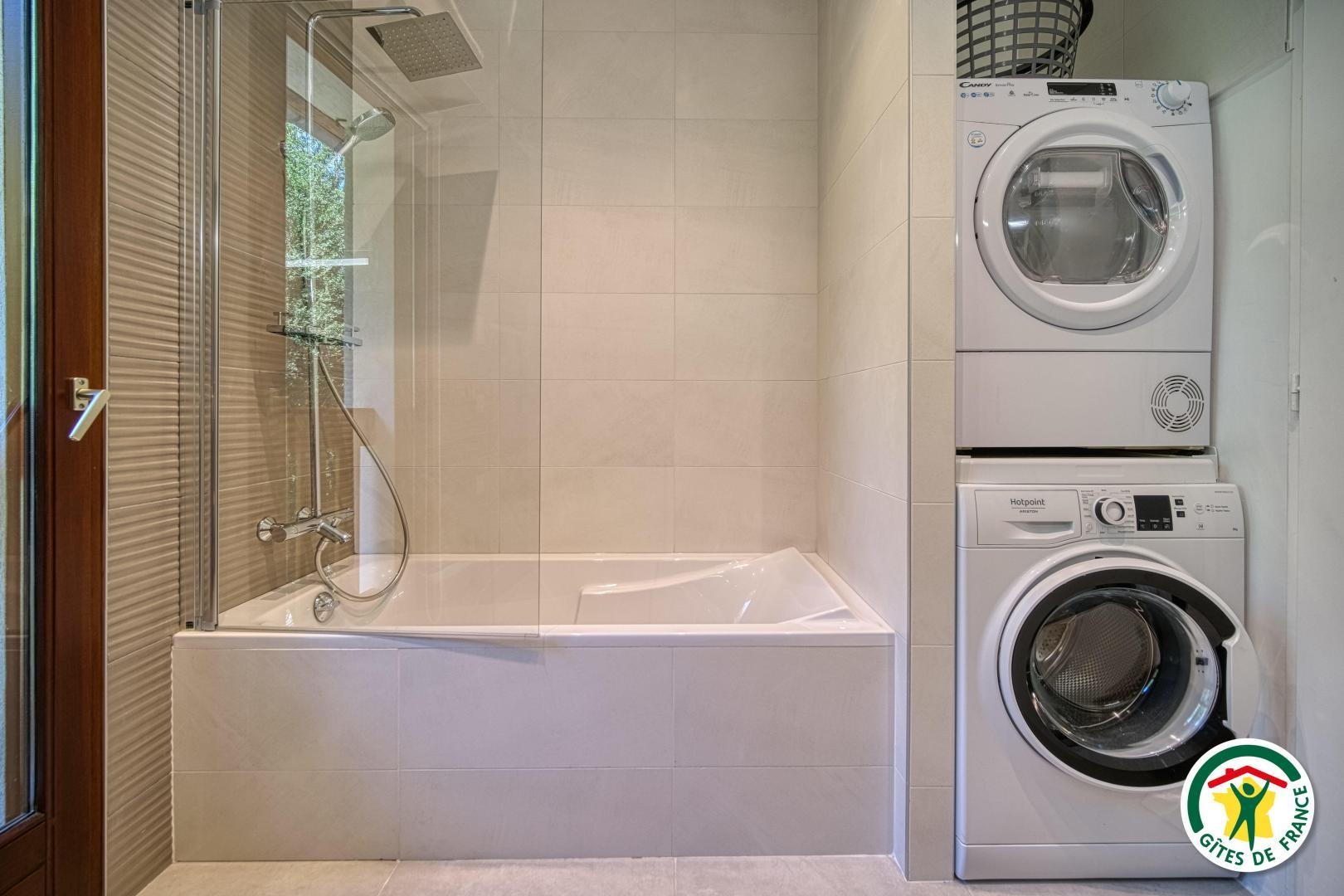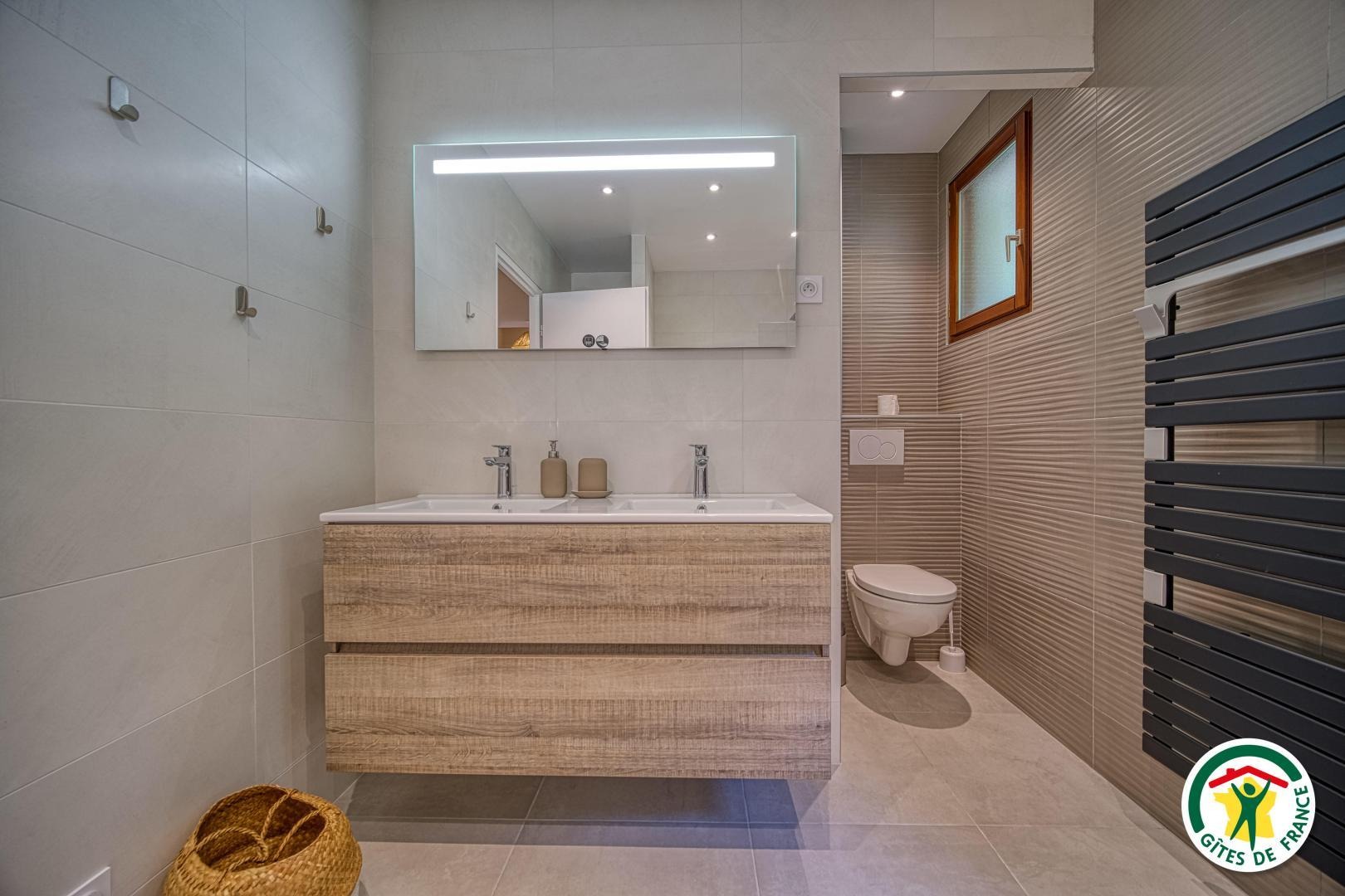 Le long du couloir, un premier WC indépendant, une belle salle de bain soigneusement décorée avec baignoire et WC, une première chambre avec deux lits de 90 cm pouvant être convertis en un lit de 180 cm avec accès à la terrasse, une seconde chambre avec un lit de 180 cm également en accès à la terrasse, et une troisième chambre avec un lit de 160x200 cm et sa propre salle de bain.