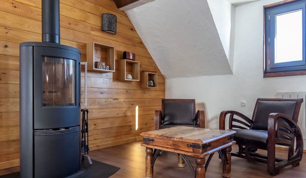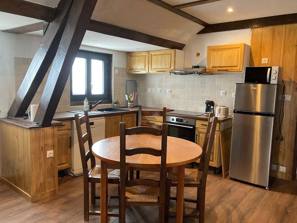 Profitez d'une cuisine entièrement équipée – four, lave-vaisselle, cafetière filtre, appareil à raclette, et bien plus – ouverte sur un salon cosy avec poêle à bois, parfait pour partager des moments conviviaux.