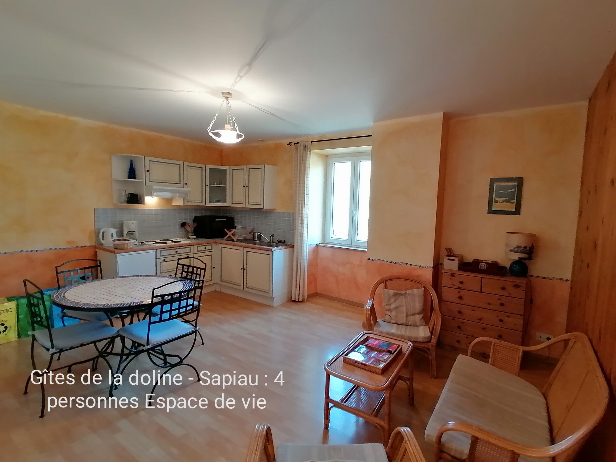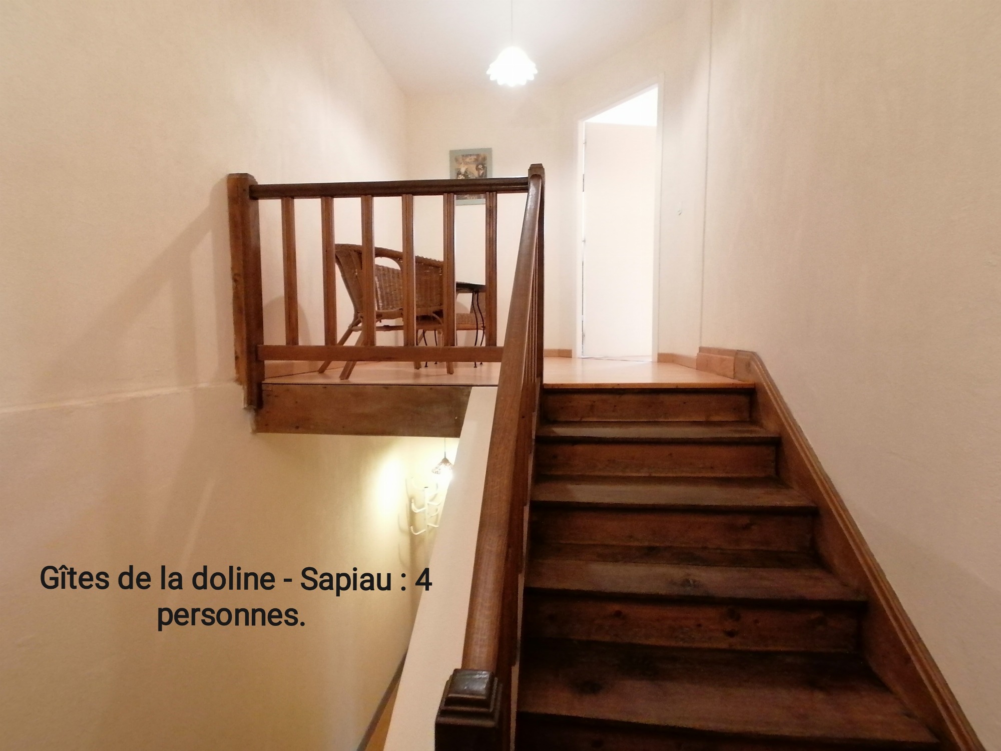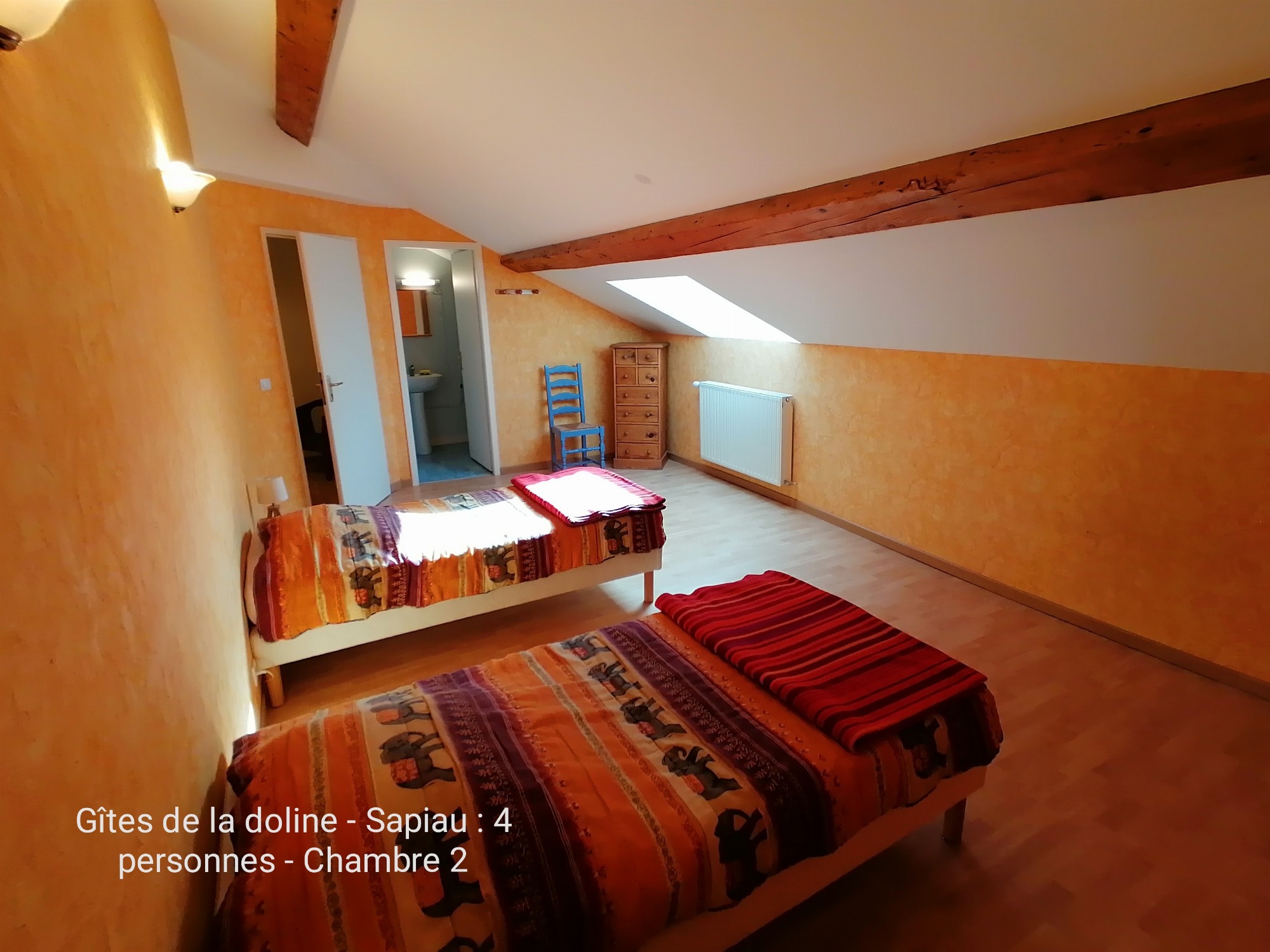 A l'intérieur du gite, 1pièce à vivre spacieuse (cuisine+espace détente) permet de vivre les temps de repas et de repos. Au même niveau, 1 chambre avec 1 lit double (140), 1 salle d'eau, wc. Au 2ème niveau, 1 chambre avec 2 lits simples (90 cm) et un cabinet de toilette.