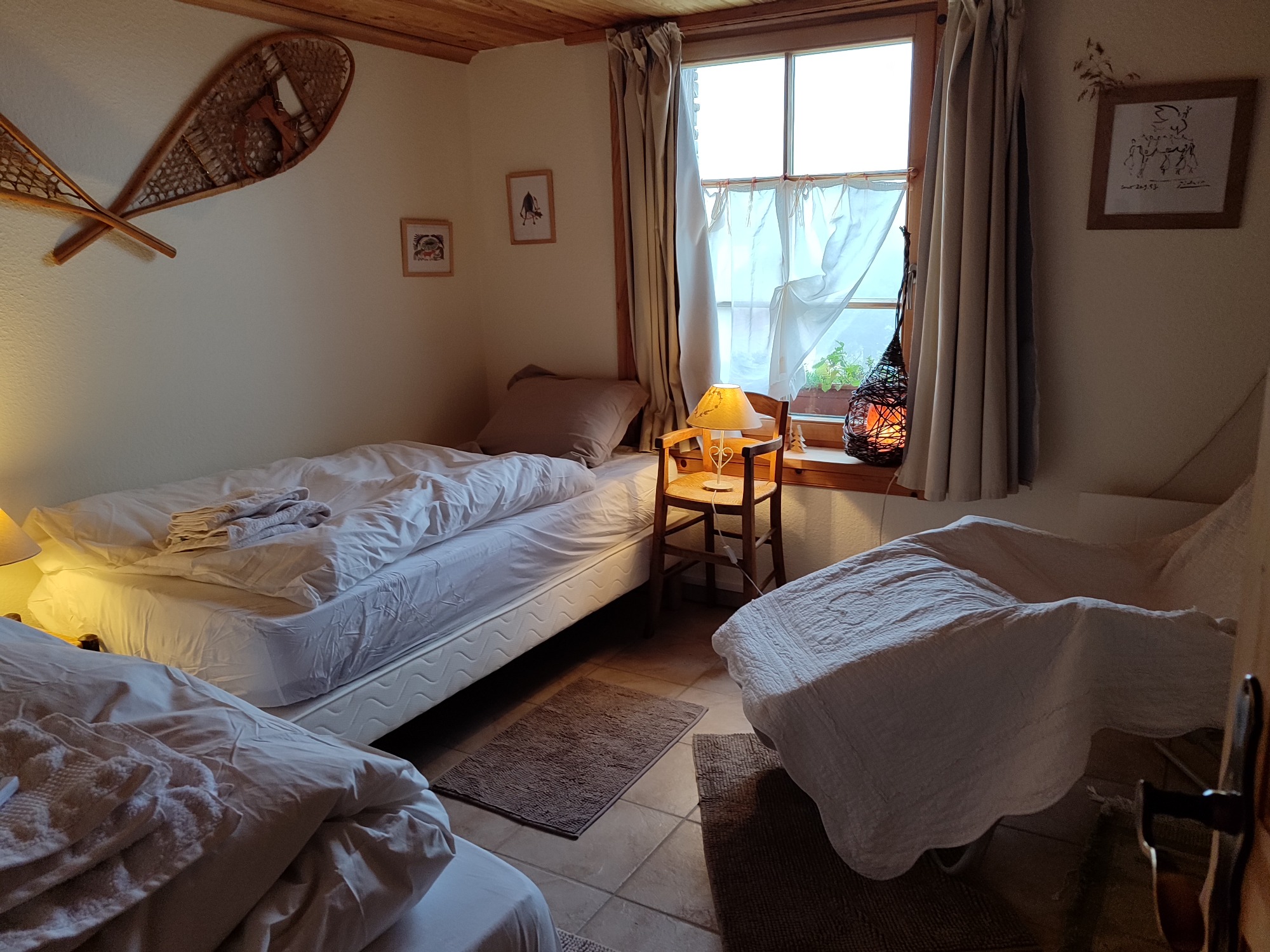 Une chambre cosy pour deux, avec deux lits simple, dans un chalet en rondins, pour les amoureux de grands espaces.