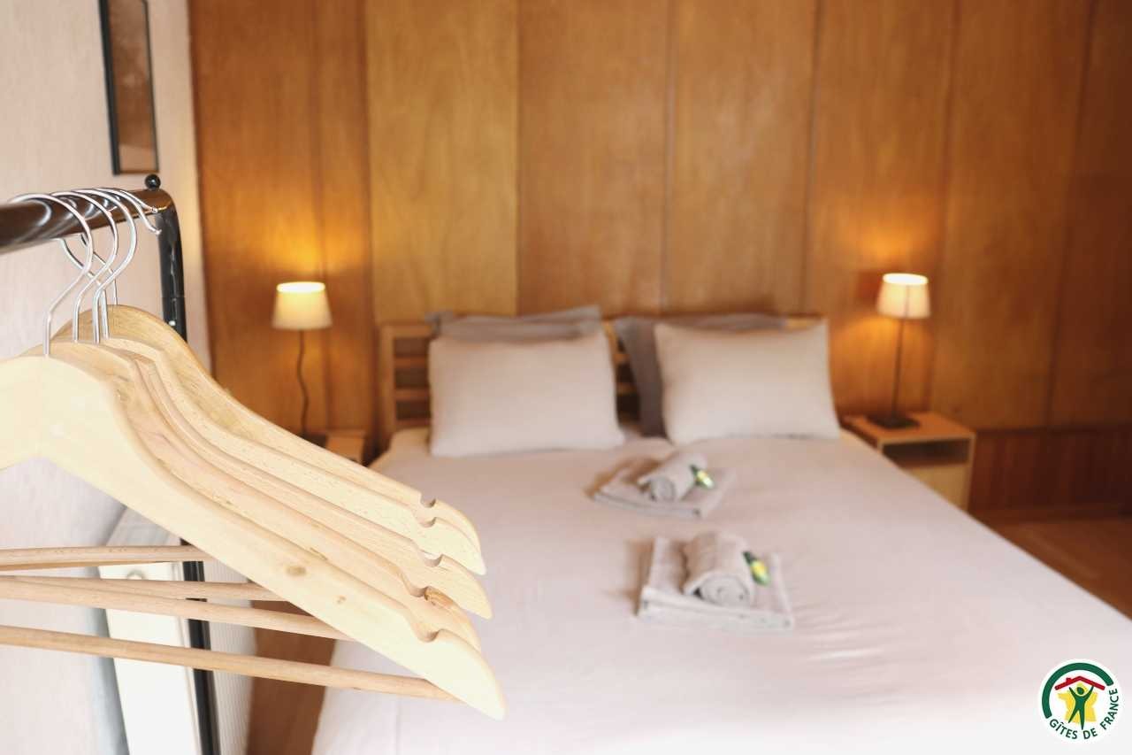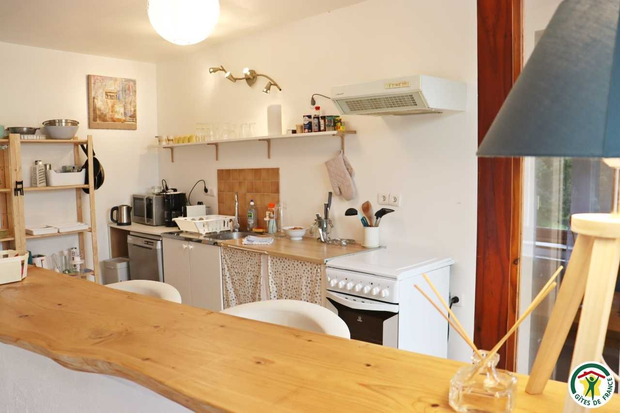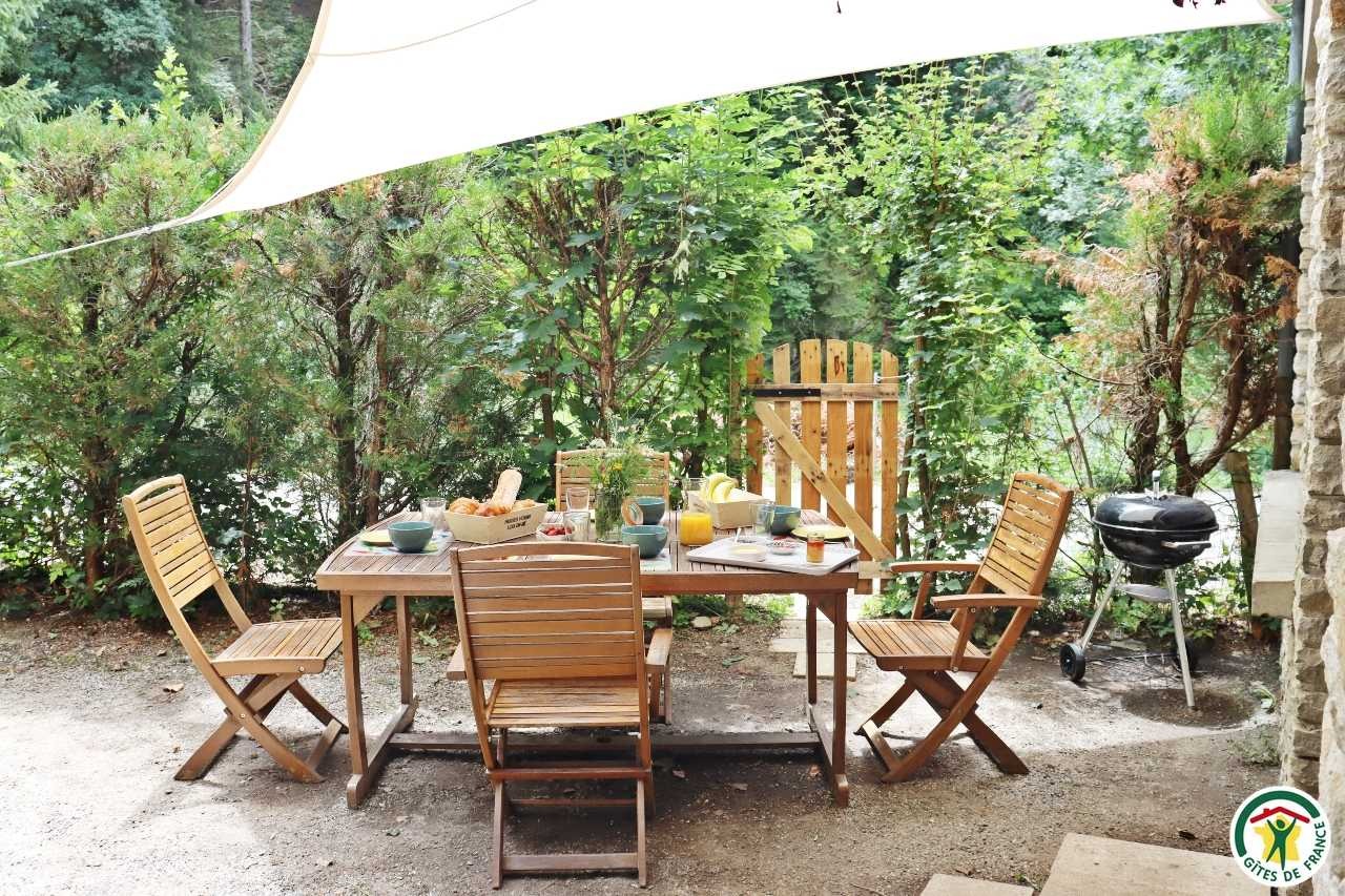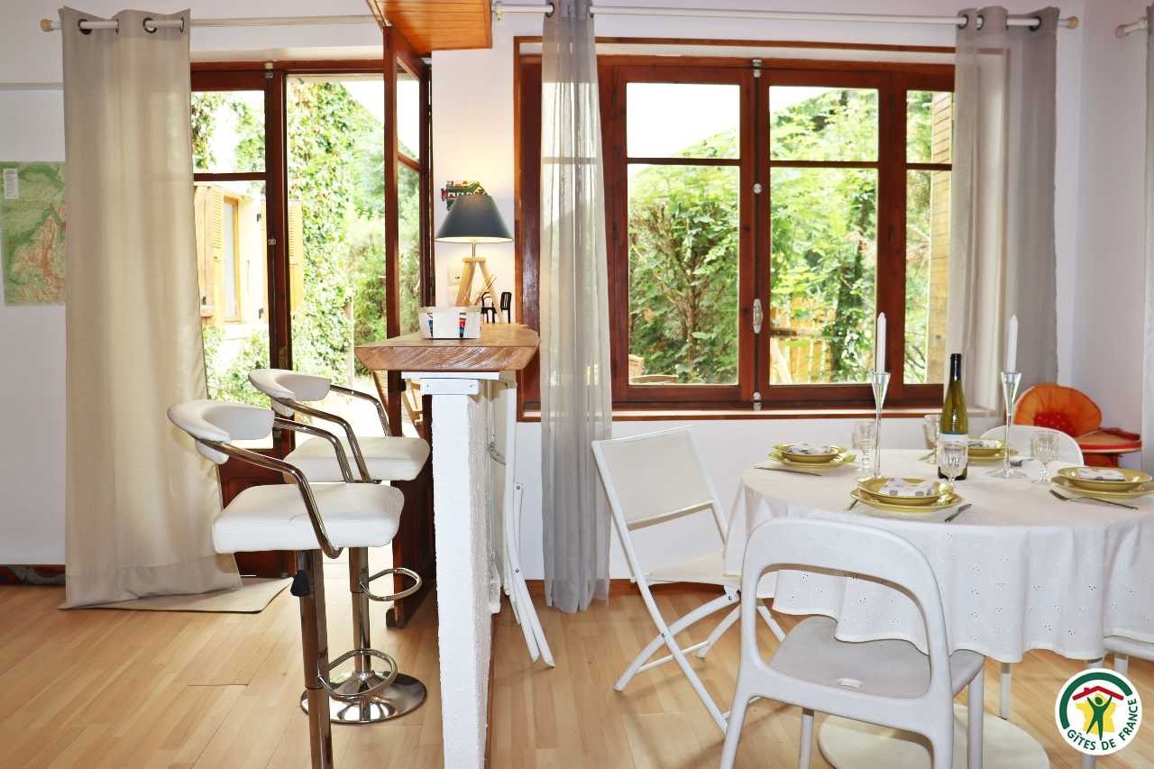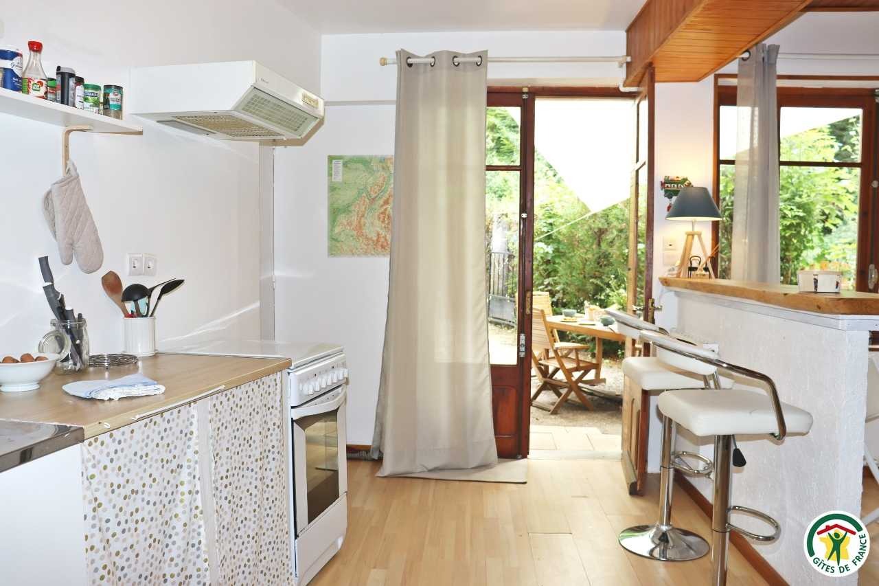 Gîte mitoyen à l'habitation des propriétaires avec entrée indépendante. Rez-de-chaussée : cuisine ouverte sur le séjour, espace repas et coin salon (canapé convertible 1x140), TV, fauteuil, salle d'eau/WC (douche rideau). A l'étage : salle d'eau/WC (douche rideau) et trois chambres. La première chambre dispose de deux lits simples ou d'un lit double (2x80 ou 1x160), la deuxième chambre d'un lit double (1x160) et accès à un balcon, la troisième chambre, plus petite, dispose de deux lits simples dont un lit superposé (2x90). Depuis la pièce à vivre du rez-de-chaussée, accès à la terrasse avec salon de jardin, barbecue charbon de bois, l'espace est clos avec deux portillons. En traversant la route (peu passante), terrain en herbe à partager avec les propriétaires : table de pique-nique, bains de soleil et accès rivière pour la baignade. 2 à 3 places de stationnement sur la propriété. A proximité de la D103.
