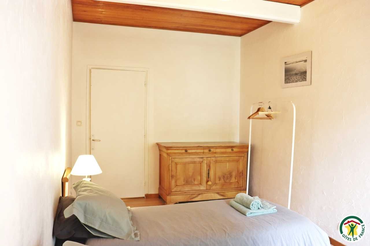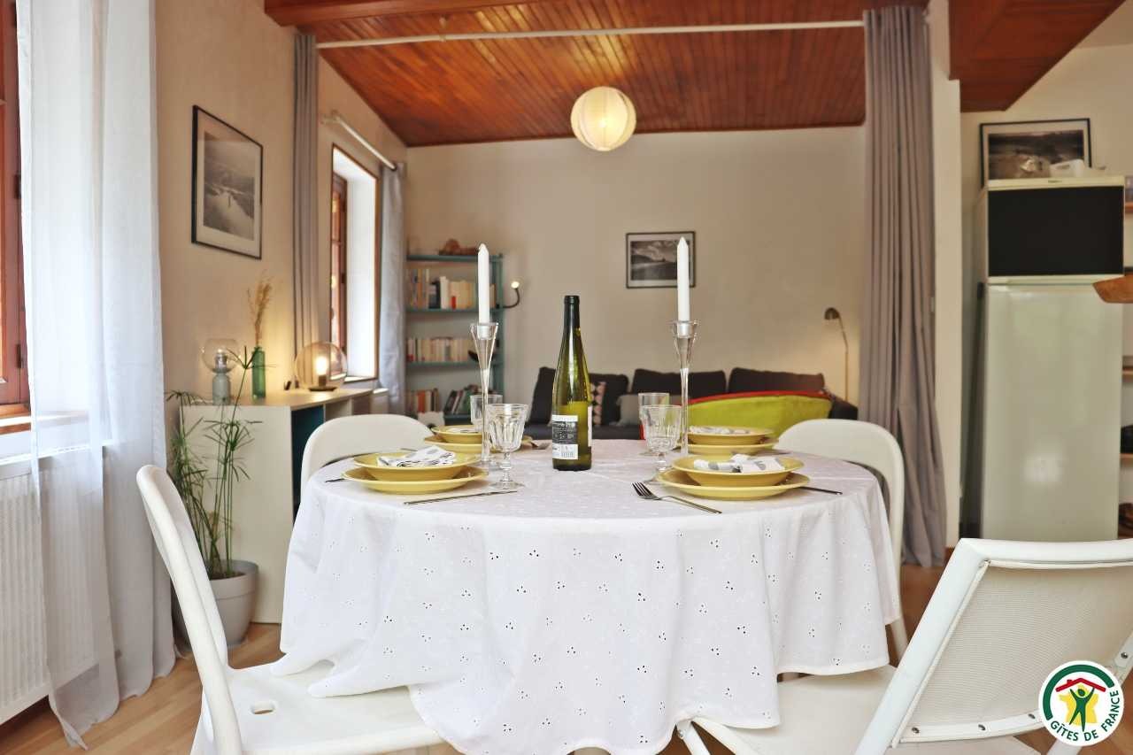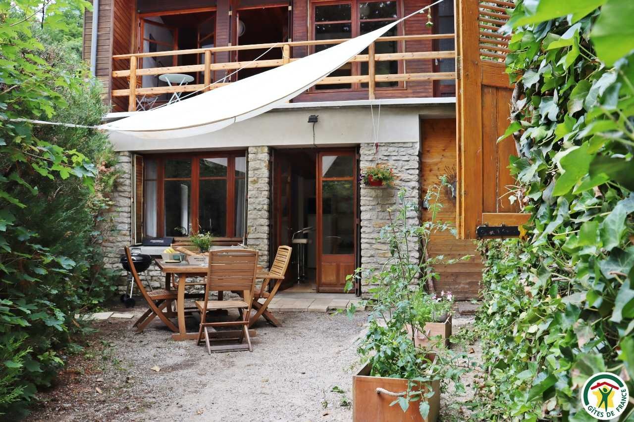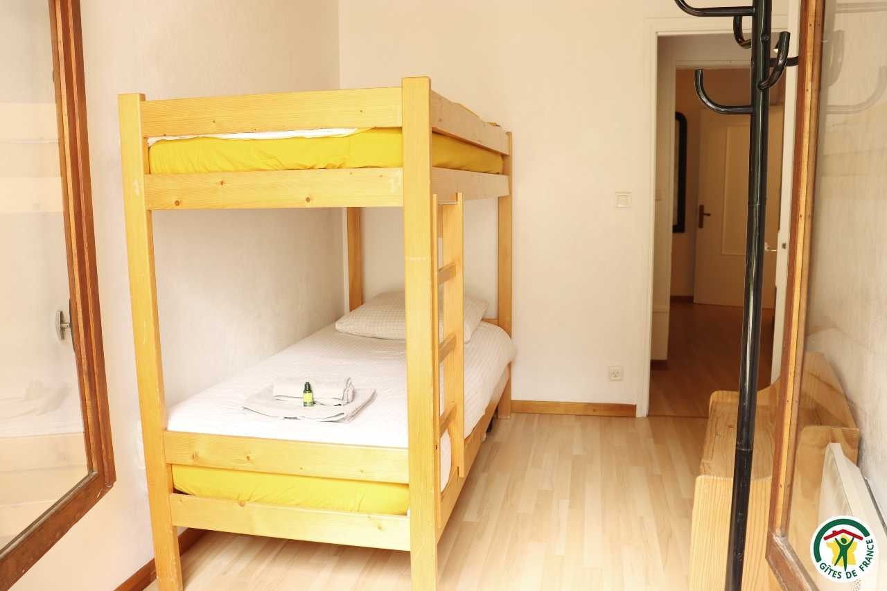 Gîte mitoyen à l'habitation des propriétaires avec entrée indépendante. Rez-de-chaussée : cuisine ouverte sur le séjour, espace repas et coin salon (canapé convertible 1x140), TV, fauteuil, salle d'eau/WC (douche rideau). A l'étage : salle d'eau/WC (douche rideau) et trois chambres. La première chambre dispose de deux lits simples ou d'un lit double (2x80 ou 1x160), la deuxième chambre d'un lit double (1x160) et accès à un balcon, la troisième chambre, plus petite, dispose de deux lits simples dont un lit superposé (2x90). Depuis la pièce à vivre du rez-de-chaussée, accès à la terrasse avec salon de jardin, barbecue charbon de bois, l'espace est clos avec deux portillons. En traversant la route (peu passante), terrain en herbe à partager avec les propriétaires : table de pique-nique, bains de soleil et accès rivière pour la baignade. 2 à 3 places de stationnement sur la propriété. A proximité de la D103.